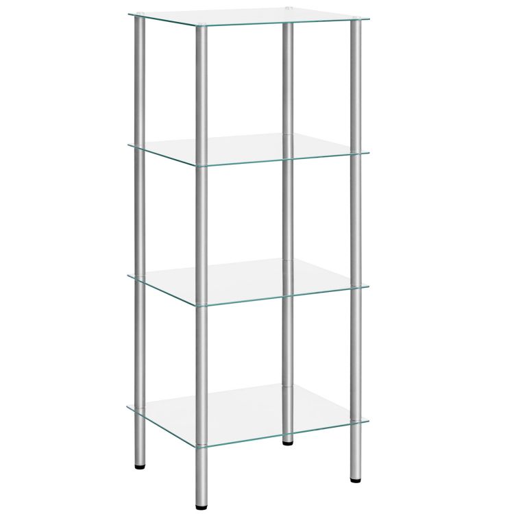 glass shelf, 4 tier silver standing shelf unit, durable glass shelving stand for small space, space-saving, for bathroom, bedroom, home office, tempered glass, steel frame, silver sv04cj01