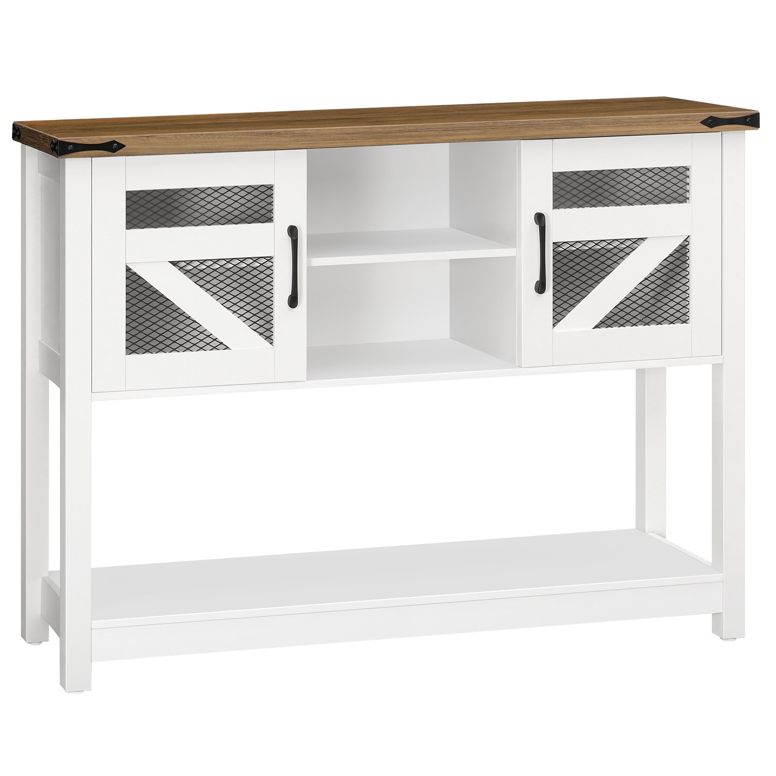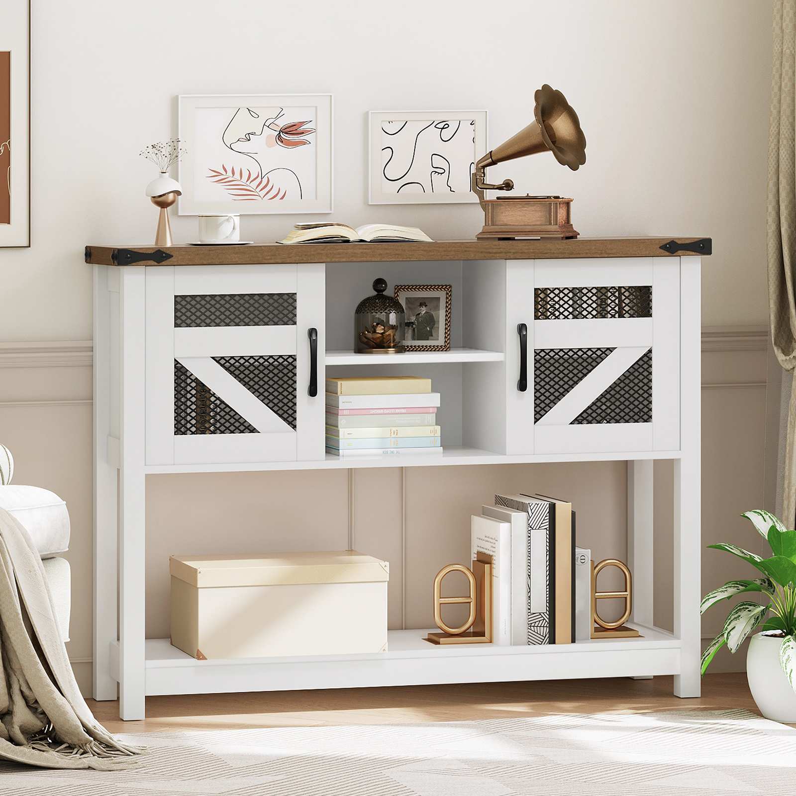 Farmhouse-Style Console Table with Storage, 110cm Narrow Entryway Table Featuring Open Shelf and 2 Cabinets, Multifunctional Sofa Side Table for Living Room, White & Walnut Finish