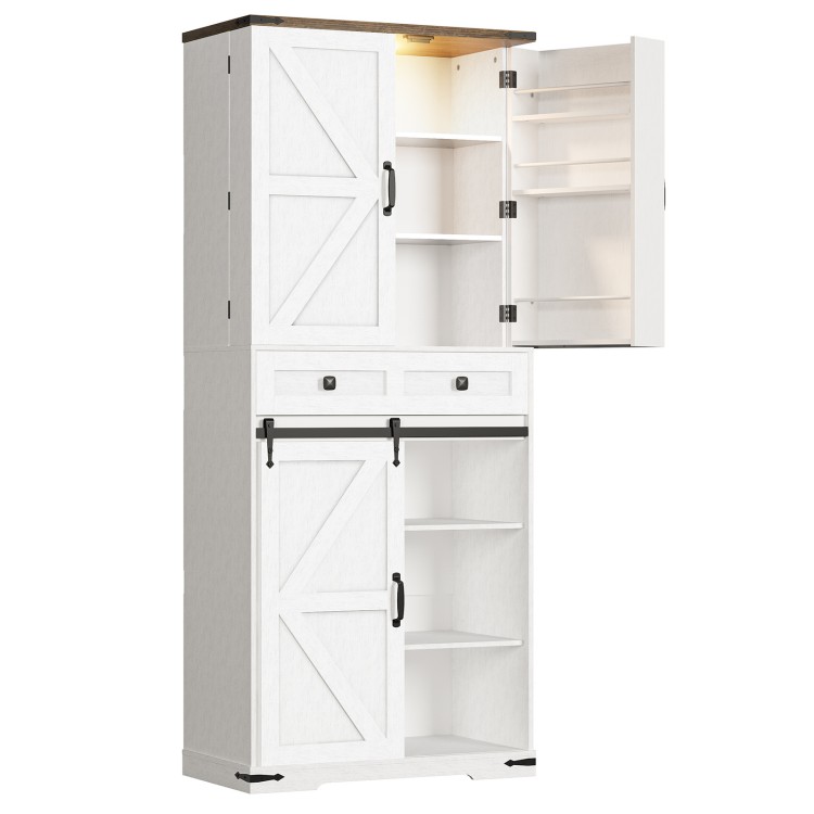 Farmhouse Kitchen Pantry Cabinet, 71.6 Storage Cabinet with LED Light and Sliding Barn Door, Pantry Cabinet with Adjustable Shelf and Drawer, for Kitchen, Dining Room, White and