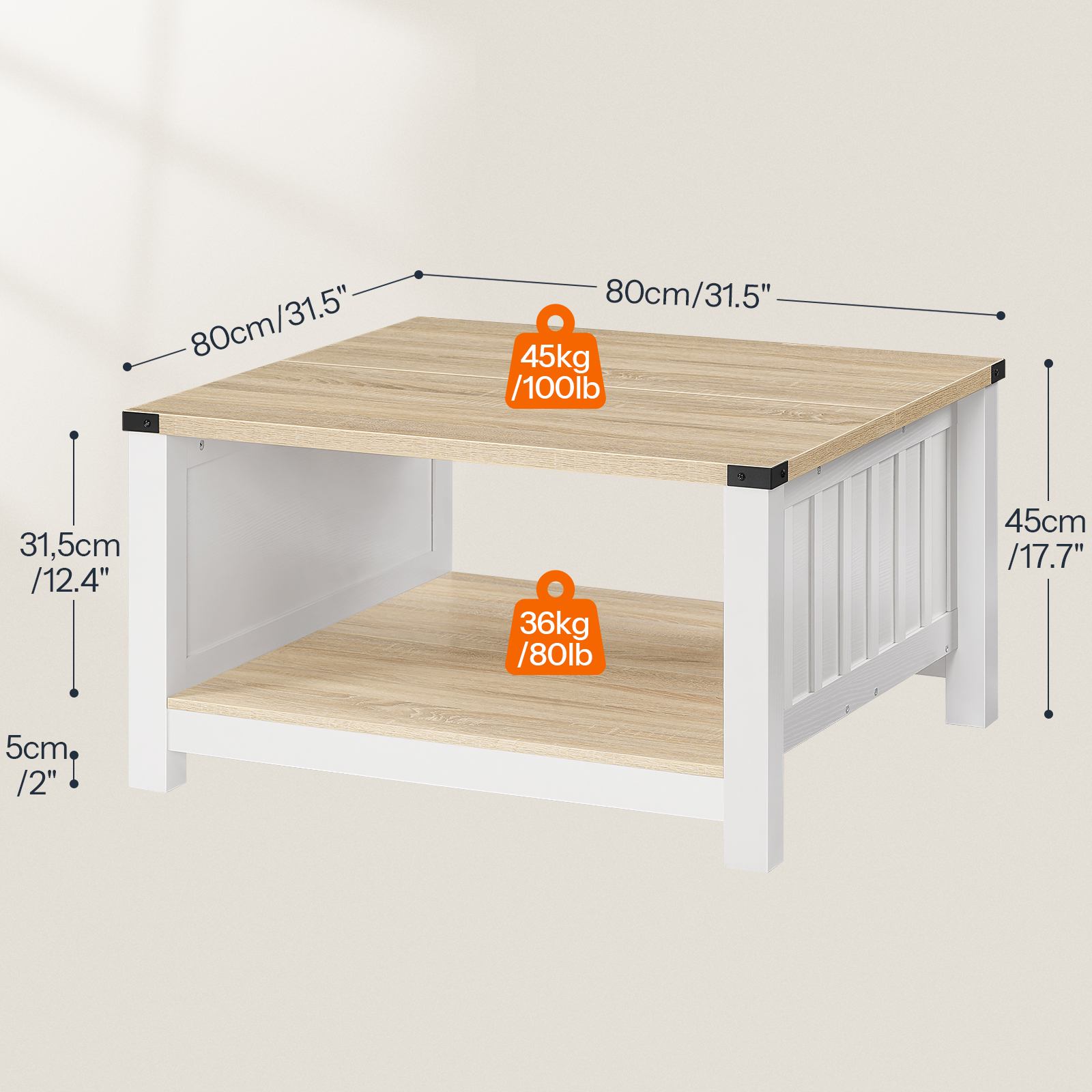 Ample Storage Capacity: With overall dimensions of 80cm (L) × 80cm (W) × 45cm (H), the coffee table features a spacious tabletop and a wide lower shelf, capable of accommodating daily items such as coffee cups, potted plants, books, snacks and beverage trays to meet diverse usage requirements.