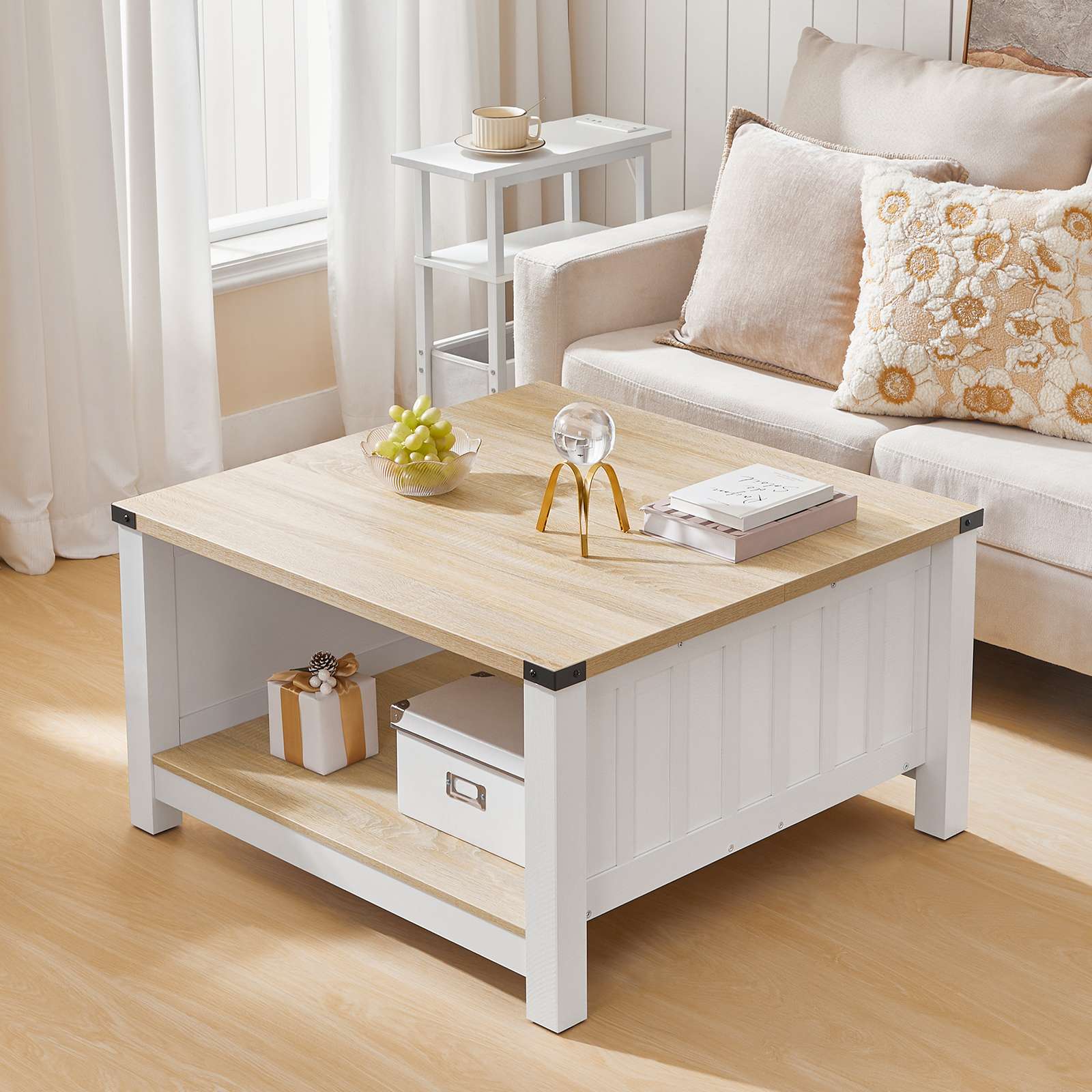 Farmhouse Style Square Coffee Table, Natural Finish Wooden Cocktail Table with Semi-Open Compartment, Suitable for Living Room and Meeting Room