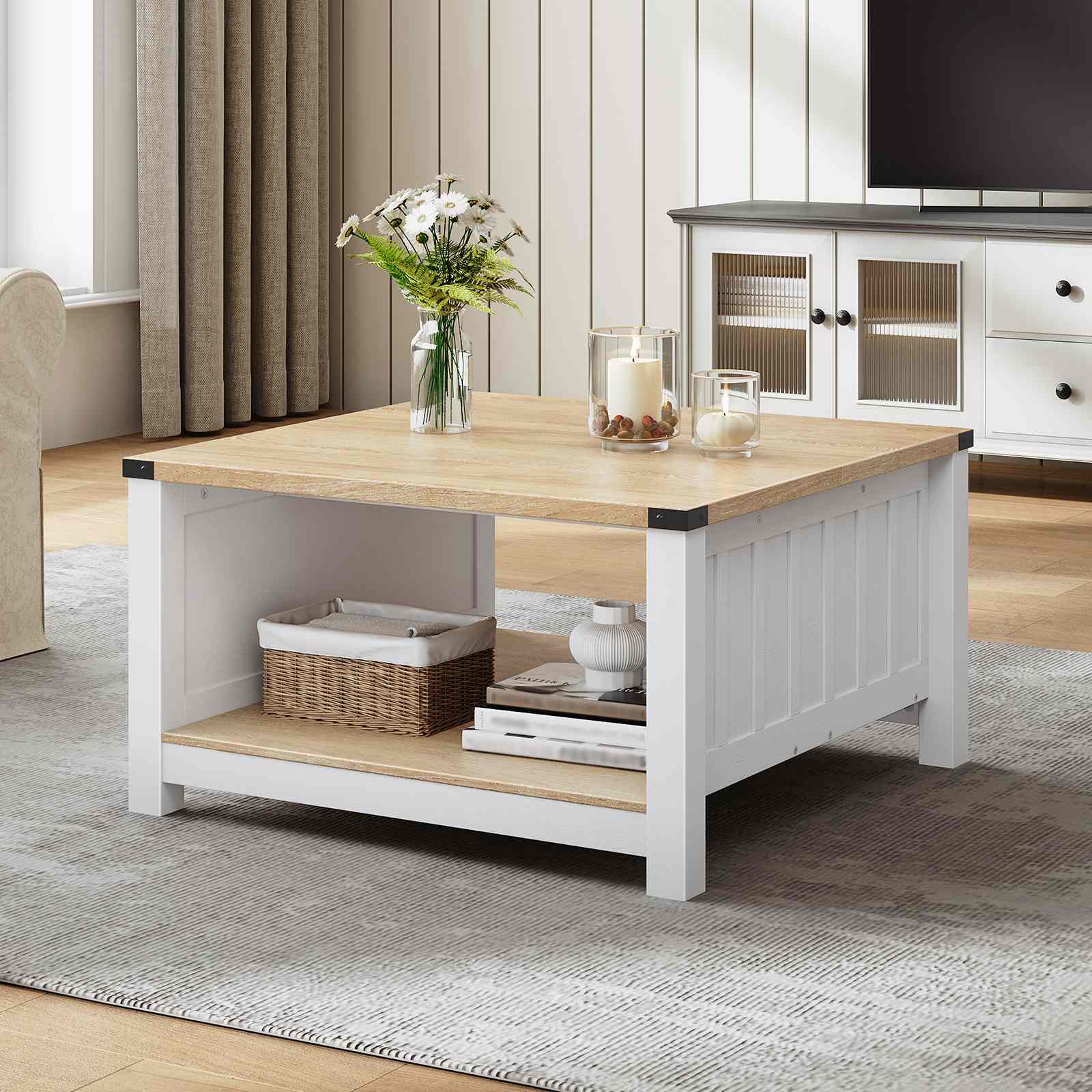This coffee table includes two storage tiers, ideal for holding items like coffee cups, plants, books, and storage baskets. Crafted from high-quality, thickened particleboard, it features reinforced slats and sturdy wooden legs for enhanced stability. With a minimalist farmhouse design, this table seamlessly blends with various home decor styles, adding a touch of nature and comfort to your living room or bedroom.