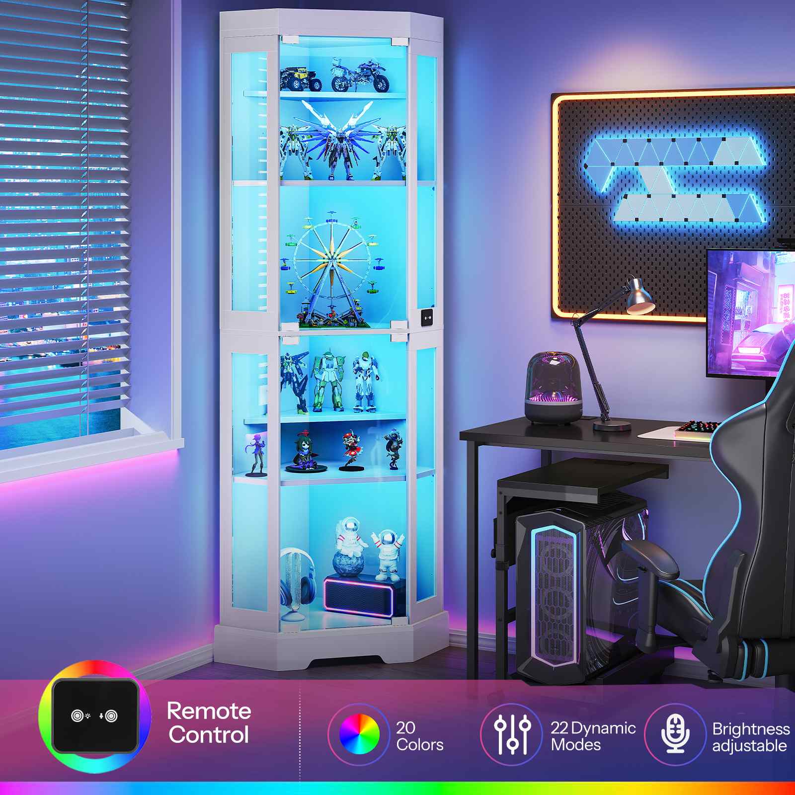 This cabinet features an adjustable 3-color LED light strip to brilliantly showcase your collectibles and set the desired mood with a touch. The lower framed doors offer discreet storage to keep clutter out of sight. Built with sturdy MDF and tempered glass, this tall, space-saving corner cabinet fits snugly into corners. Easy to assemble, it's the versatile display and storage solution for your living room, entryway, or bedroom.