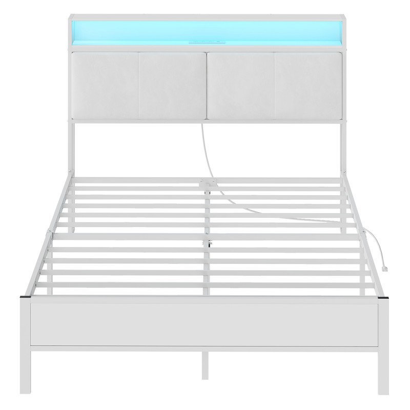 White Full Bed Frame, Metal Platform Bed Frame with Charging Station and LED Light, Headboard with Shelves, No Box Springs Needed