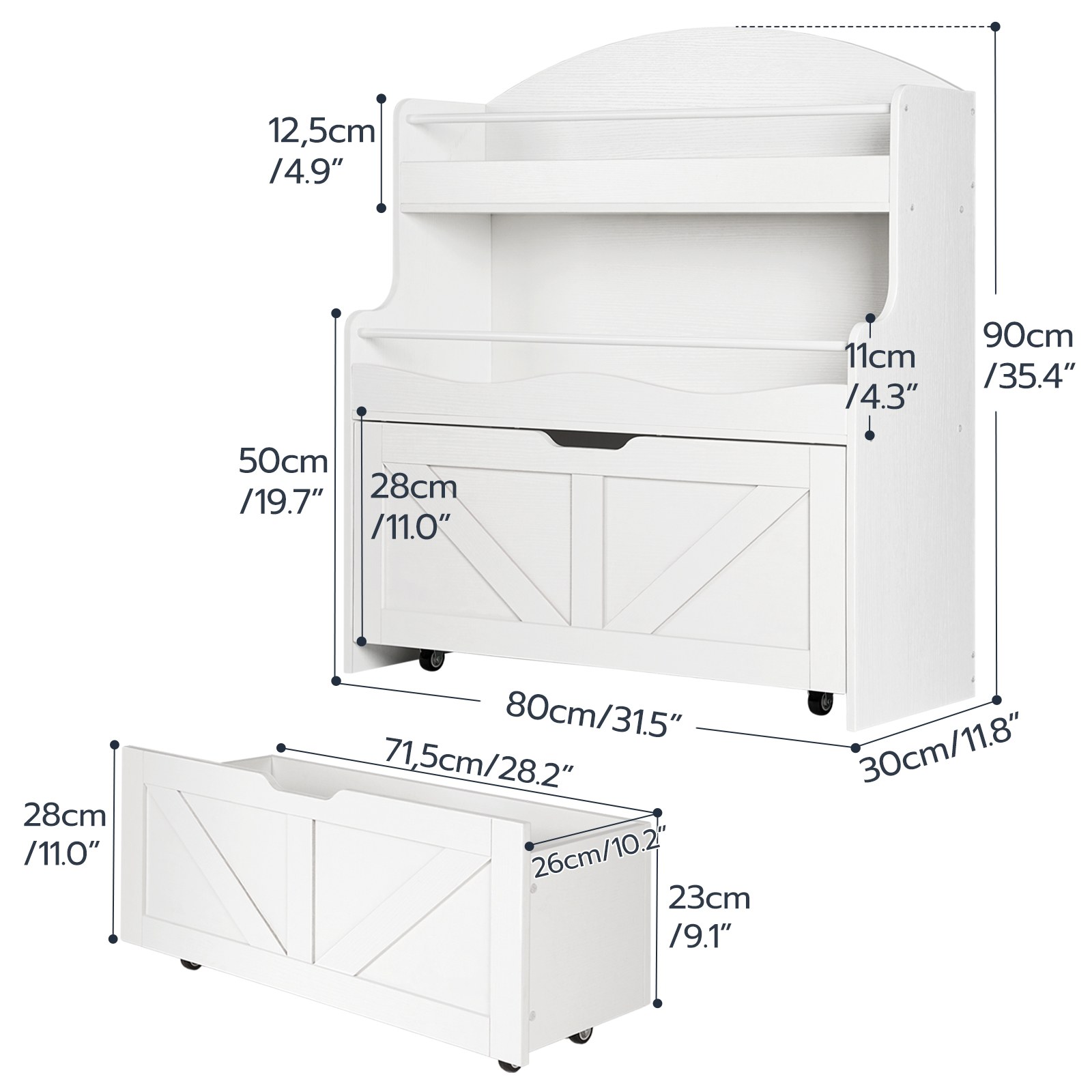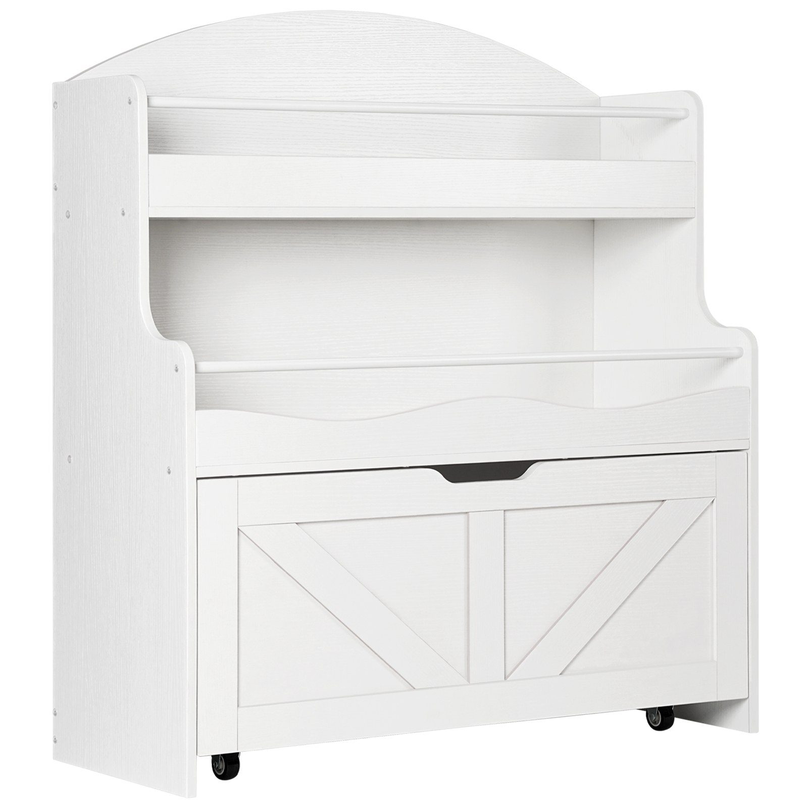 - This versatile toy storage for kids provides ample space for organizing books and toys neatly. Its trapezoidal groove handle and wheels make it easier to access items. The arc-shaped top and wavy-inspired design, combined with an anti-tip device, provide a safer usage experience.