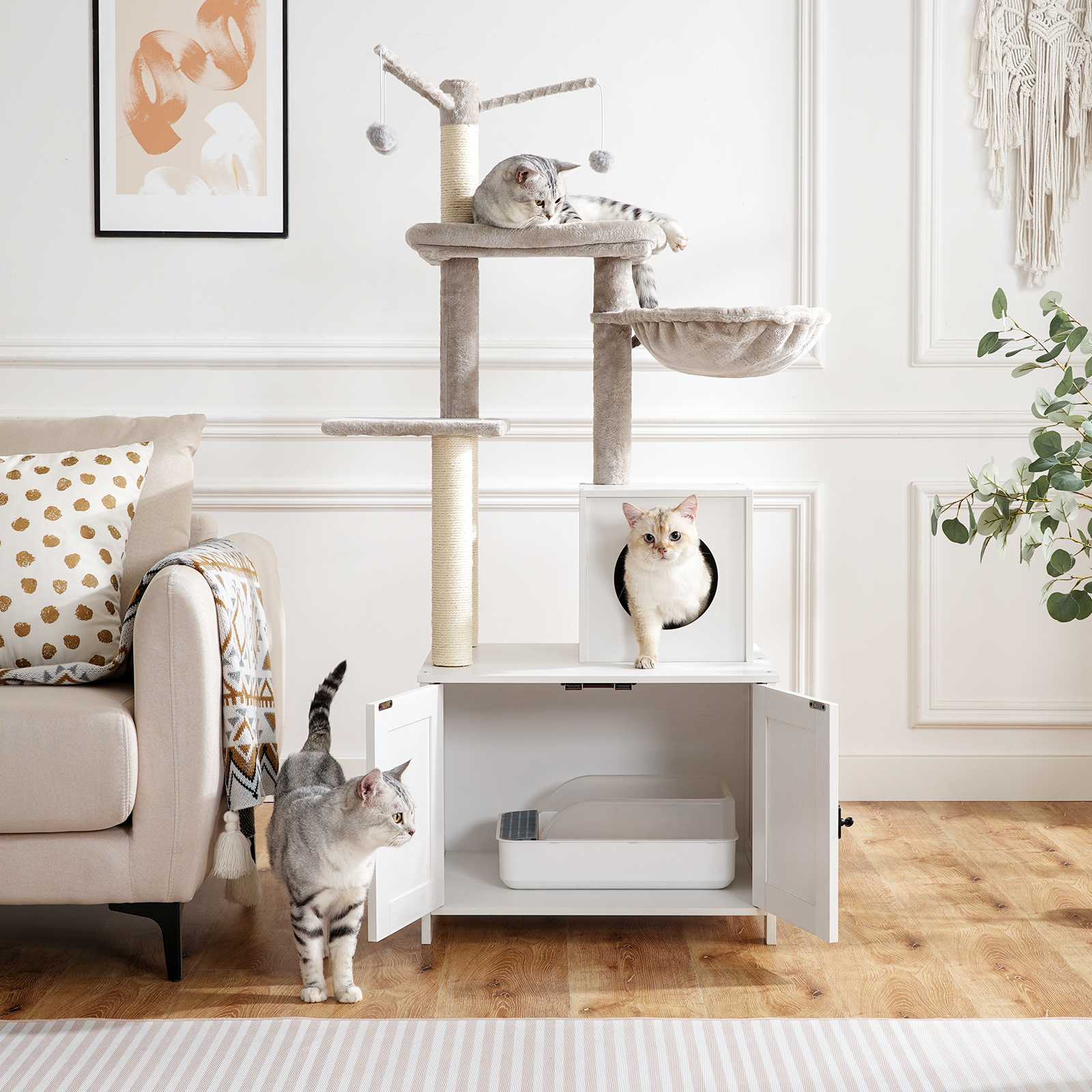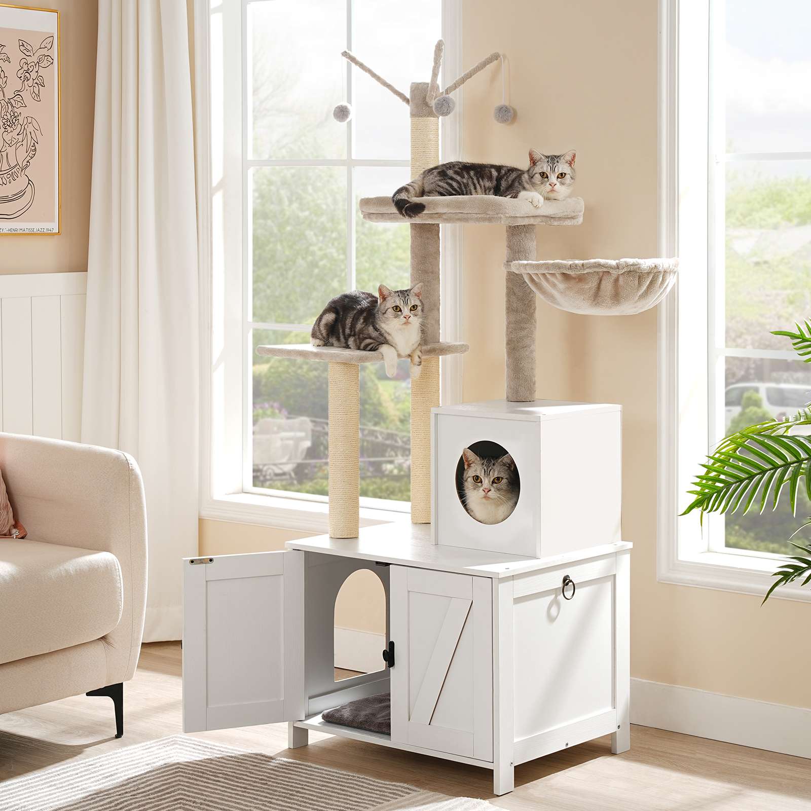 White Wooden Cat Tree Tower with Hidden Litter Box Enclosure, Multifunctional Indoor Cat Condo with Scratching Posts, All-in-One Cat Furniture Integrating Toy and House