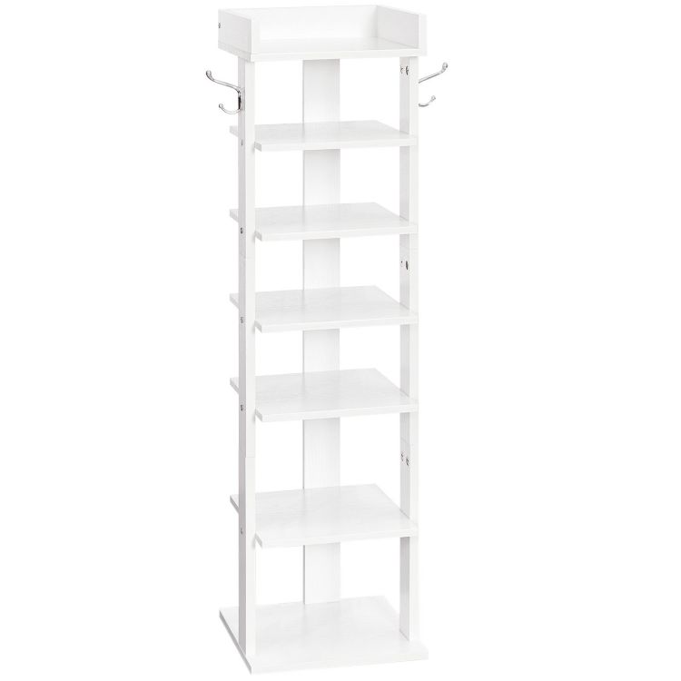 Vertical Shoe Rack, 7 Tier Shoe Storage Organizer with Hooks, Narrow Shoe Rack for 7 Pairs, Space Saving, Stable and Strong, for Entryway, Closet, Bedroom, White