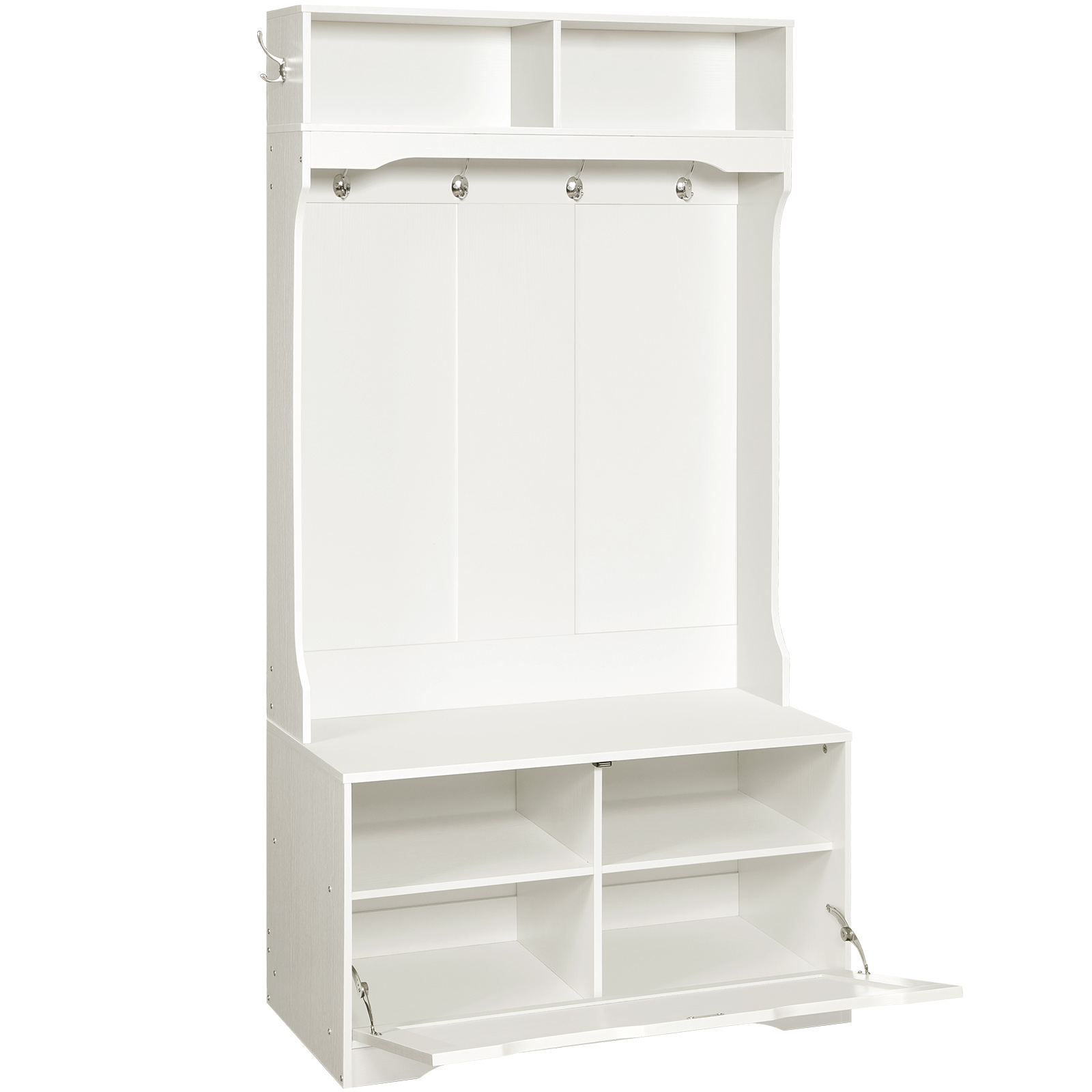 Entryway Hall Tree with Integrated Bench & Shoe Storage, Coat Rack with Flip-Down Cabinet Door, Multi-Functional Storage Solution for Mud Room, White Finish