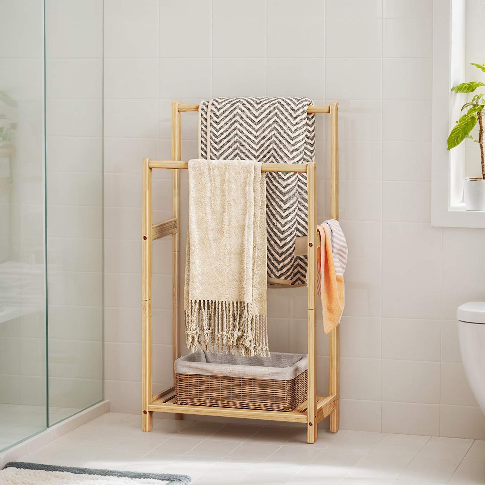 - It's freestanding bamboo towel rack is perfect for your blankets and small items and can be easily added to any bathroom, bringing extra towel storage space.