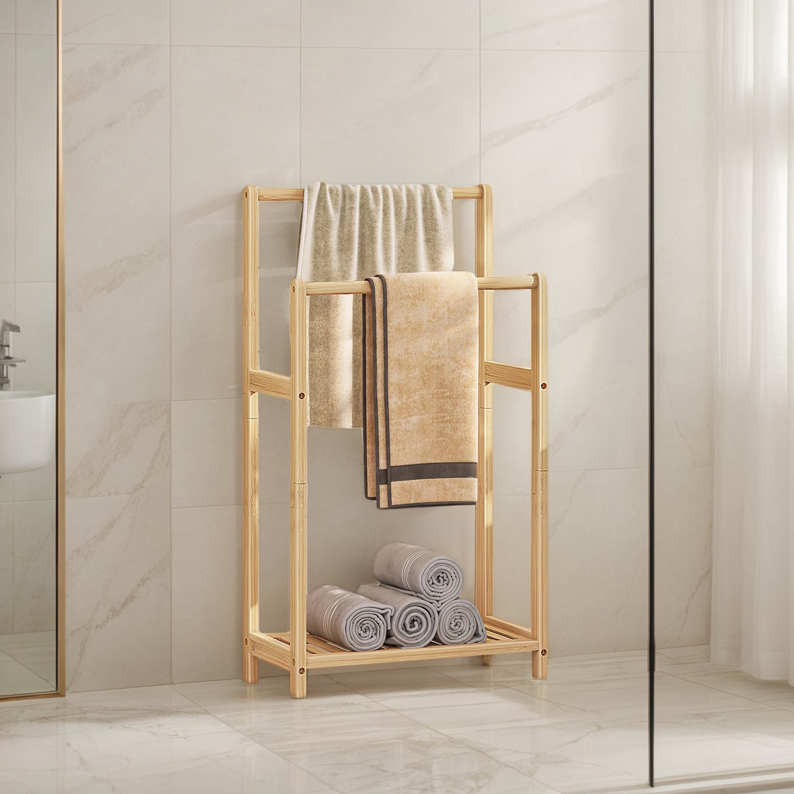 Humanized Design & Diversified Storage Functions: The bathroom towel rack adopts a 2-tier structural design, which maximizes floor space utilization. The top layer is equipped with two crossbars of different heights, suitable for hanging large bath towels, washcloths, clothes and other items. The bottom layer is designed as an open storage shelf, which can be used to organize daily bathroom supplies and spare bedding, facilitating daily sorting and storage.
