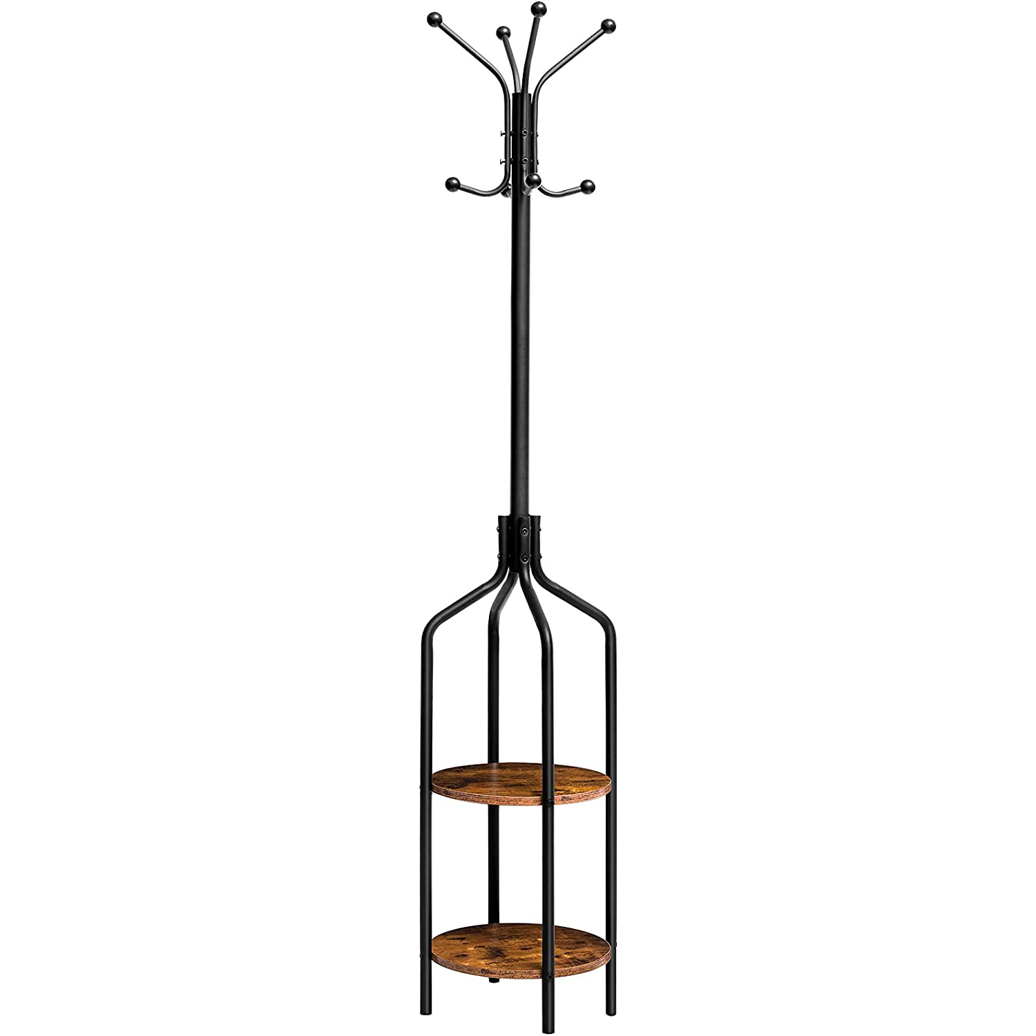 Cabide independente com 2 Prateleiras e 8 Ganchos, Árvore de salão industrial com estrutura metálica, Marrom Rústico, Adequado para corredor, Varanda, Ideal para pendurar chapéus, Mochilas e guarda-chuvas