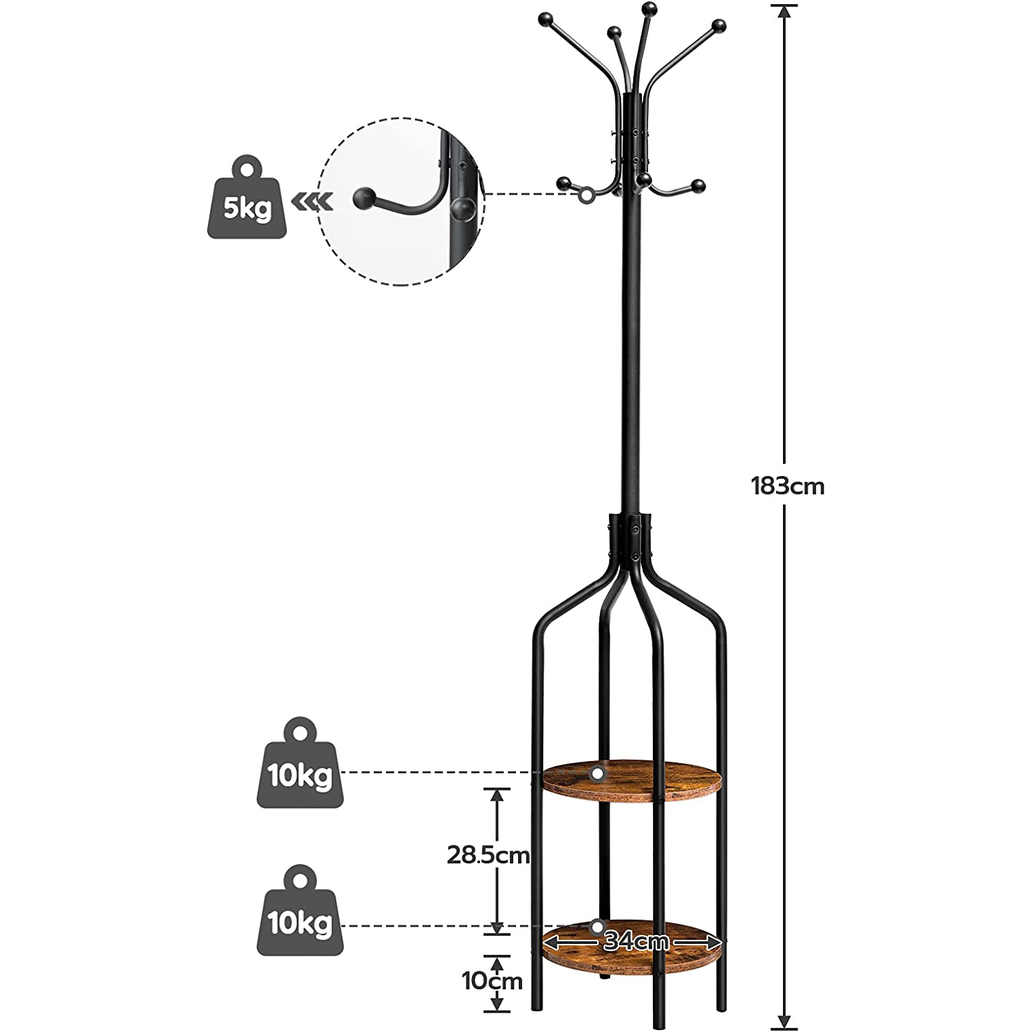 Practical Size Design: Com uma altura total de 183 cm, the coat rack is ergonomically sized for easy hanging of clothes on the hooks. The distance between the two shelves is 28.5 cm, which is suitable for placing potted plants, bolsas, decorative art pieces and other items.