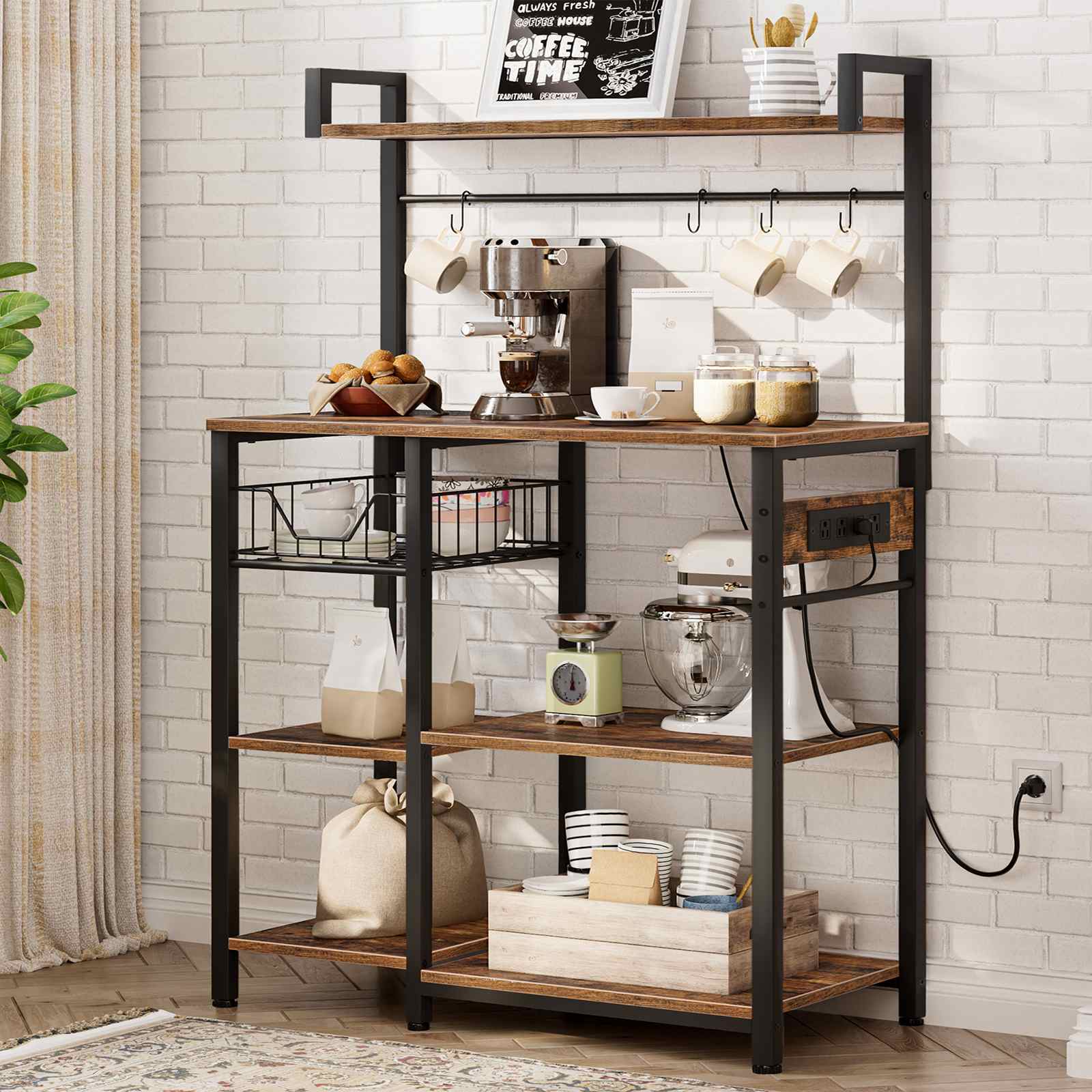 Rack de padeiros de cozinha com tomada, Café multifuncional & Suporte para forno micro-ondas, Equipado com cesto de malha e 4 Ganchos em forma de S, Prateleira versátil de armazenamento de cozinha para cozinha & Sala de estar, Marrom Rústico