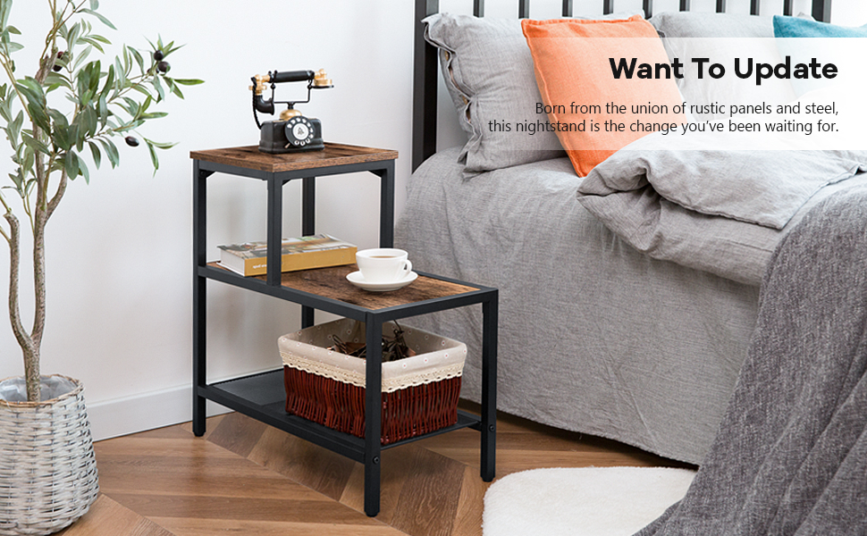 mesa lateral, 3-mesa de cabeceira estreita de camada com destaque na prateleira de escada decorativa, Tabela final de sofá industrial para pequeno espaço na sala de estar, quarto, estrutura de metal, marrom rústico e preto