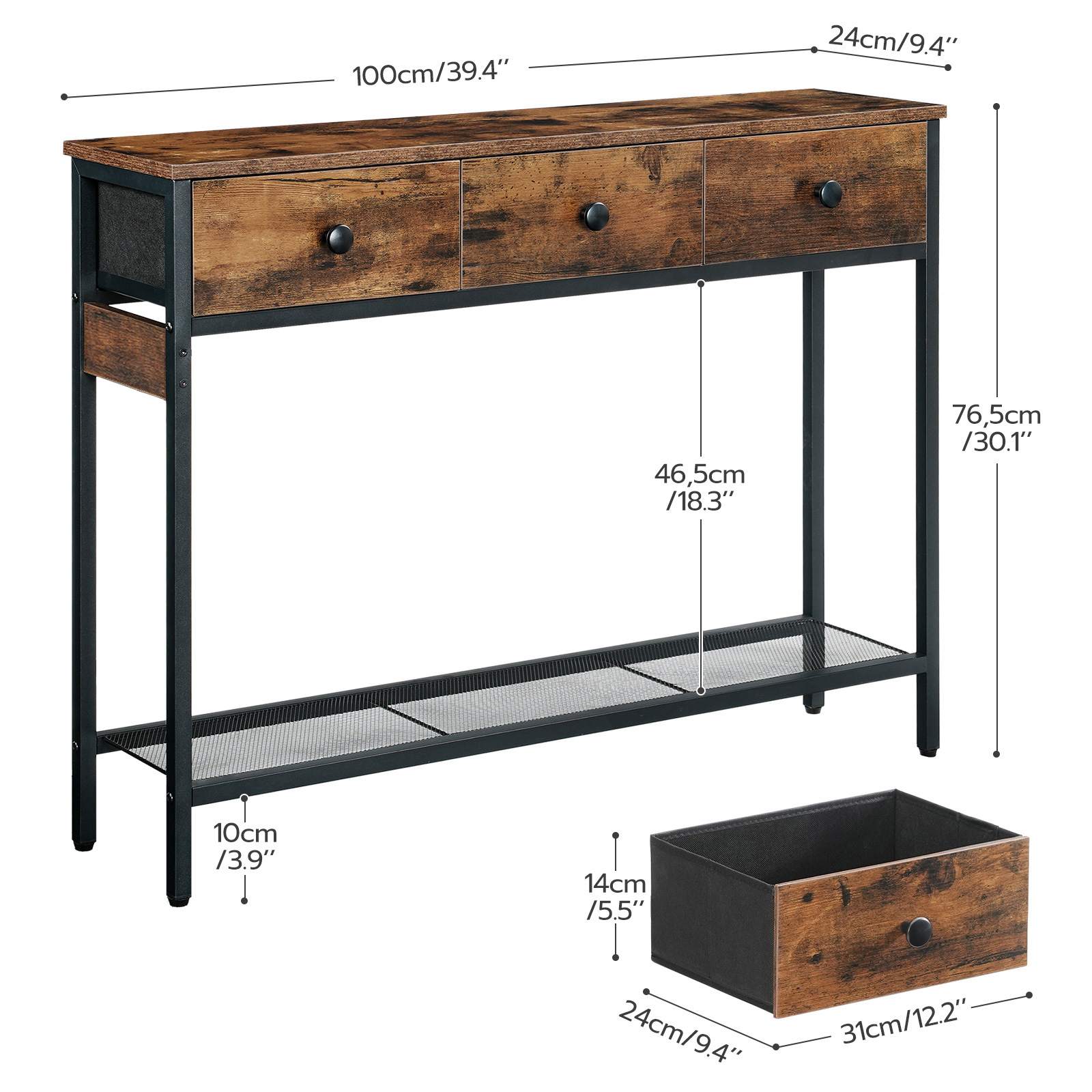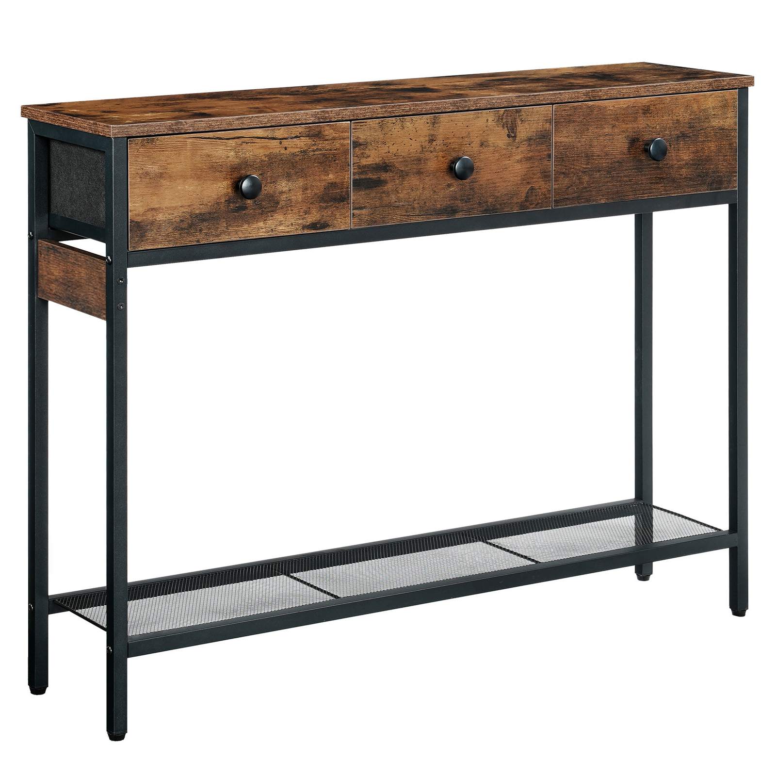 The HOOBRO hallway table combines 3 drawers made of non-woven fabric, a spacious tabletop and an open wire shelf, thus offering plenty of storage space.