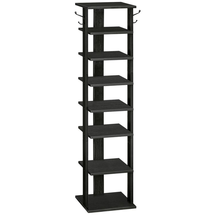 Rack de sapato vertical, 8 Organizador de armazenamento de sapatos de camada com ganchos, sapateira estreita para 8 pares, economia de espaço, estável e forte, para entrada, sala de estar, quarto, preto bk07xj01