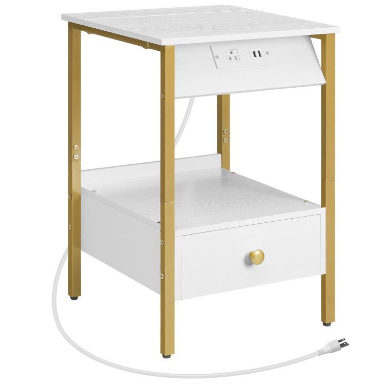 mesa de cabeceira com estação de carregamento, Tabela final simples com gaveta, armazenamento aberto e oculto, mesa lateral do sofá moderno, Para o quarto, estudar, escritório, white and gold dw60ubz01