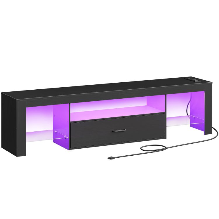 160CM черный светодиодный стенд с силовыми розетками в 75 дюйм телевизор, Игровой развлекательный центр со стеклянными полками и большим ящиком, Современный СМИ ТВ -консольный стол для гостиной спальни