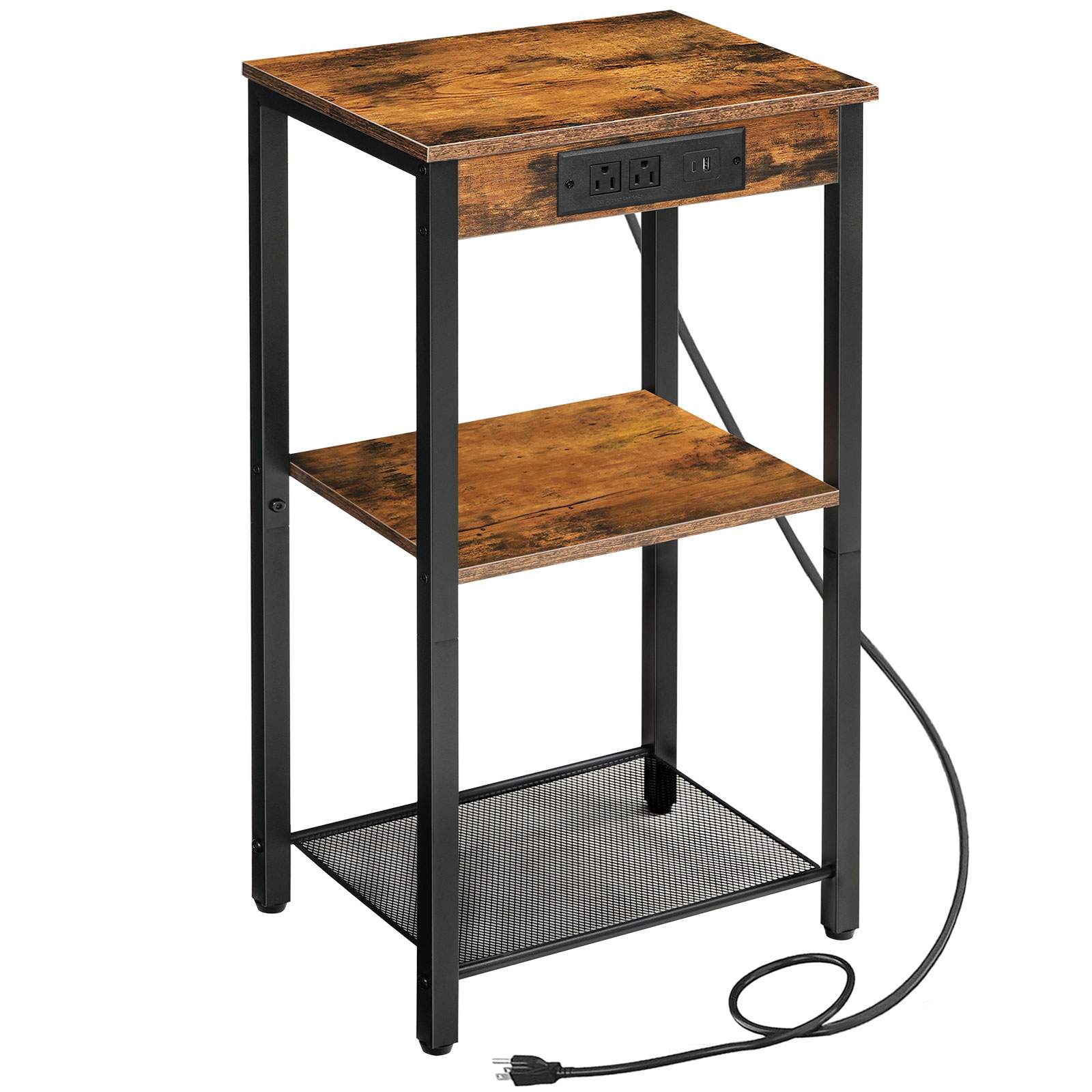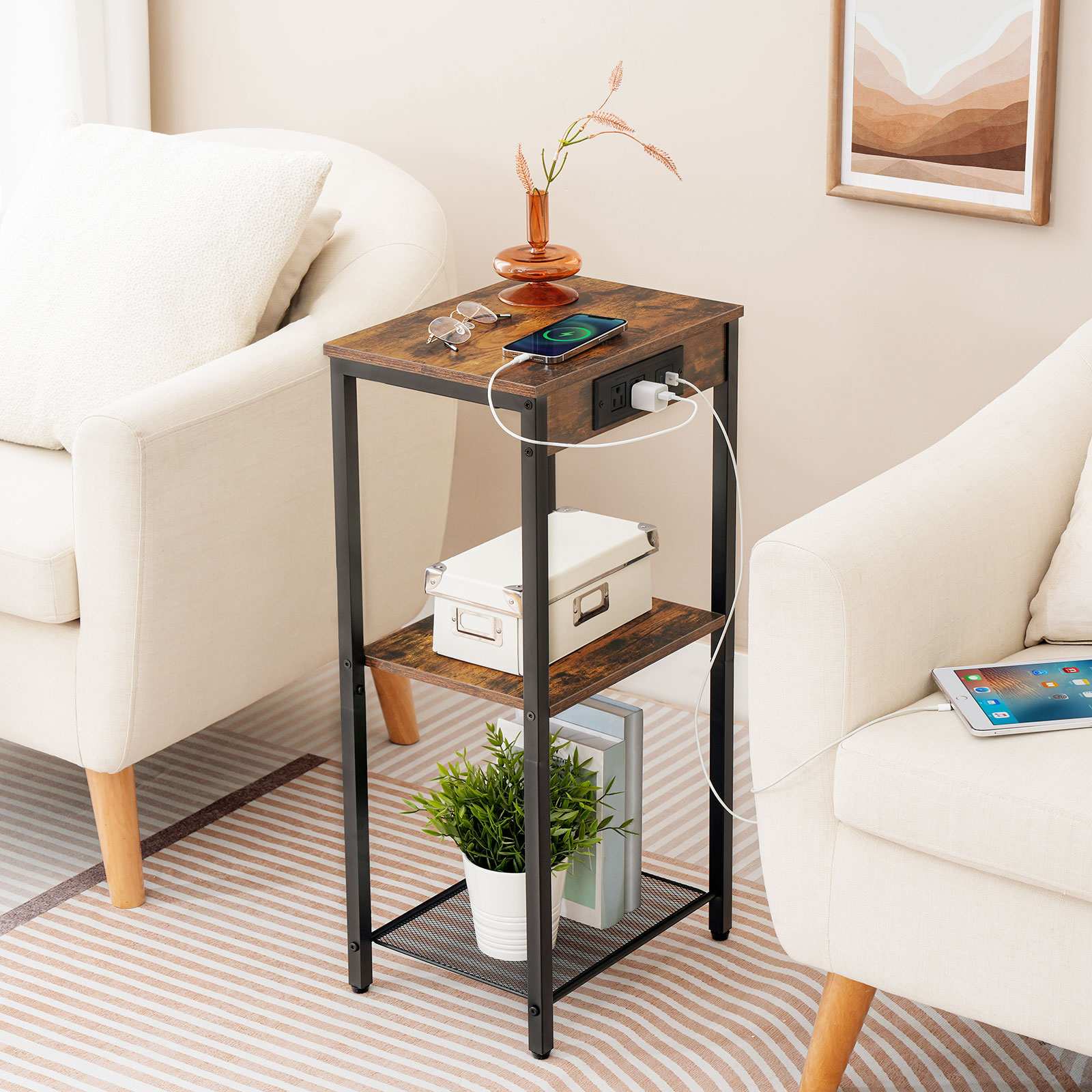 3-Высокий торцевой столик Tier со встроенной зарядной станцией, Узкий приставной столик с розетками переменного тока & USB-порты, Многофункциональное решение для хранения вещей в небольших помещениях в гостиной, Спальня & Коридор, Рустик Браун