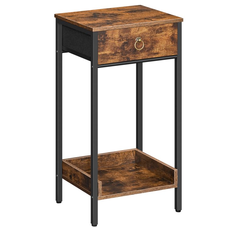 Конечный стол с хранением и ящиком для ткани, Промышленная тумбочка, 23.6 Приставной столик высотой в дюйм, Прикроватная тумбочка для гостиной спальни, Рустикальный коричневый и черный BF105BZ01