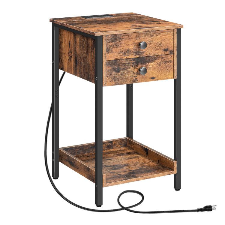 тумбочка с зарядной станцией, высокий столик, боковой стол с ящиками и полкой хранения, Телефонный стол для спальни, экономия места, Легкая сборка, rustic brown and black bf72ubz01