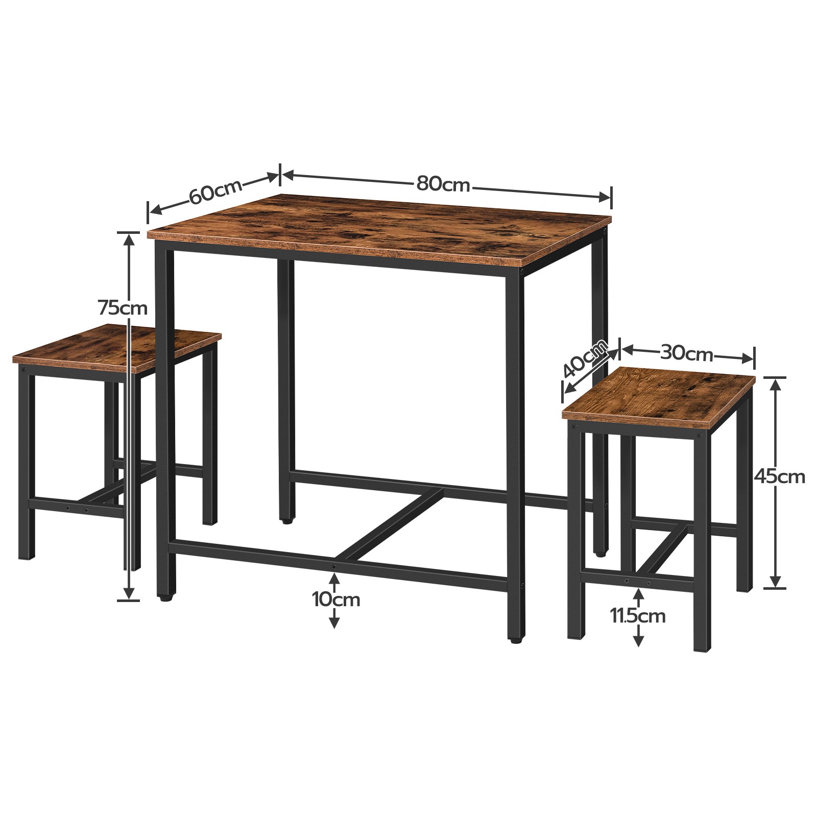 Ergonomic Size Design: The dining table dimensions are 80cm (л) × 60см (Вт) × 75см (ЧАС), and each stool measures 40cm (л) × 30см (Вт) × 45см (ЧАС). The ergonomic dimensions provide a spacious tabletop for daily use while ensuring user comfort during extended seating.