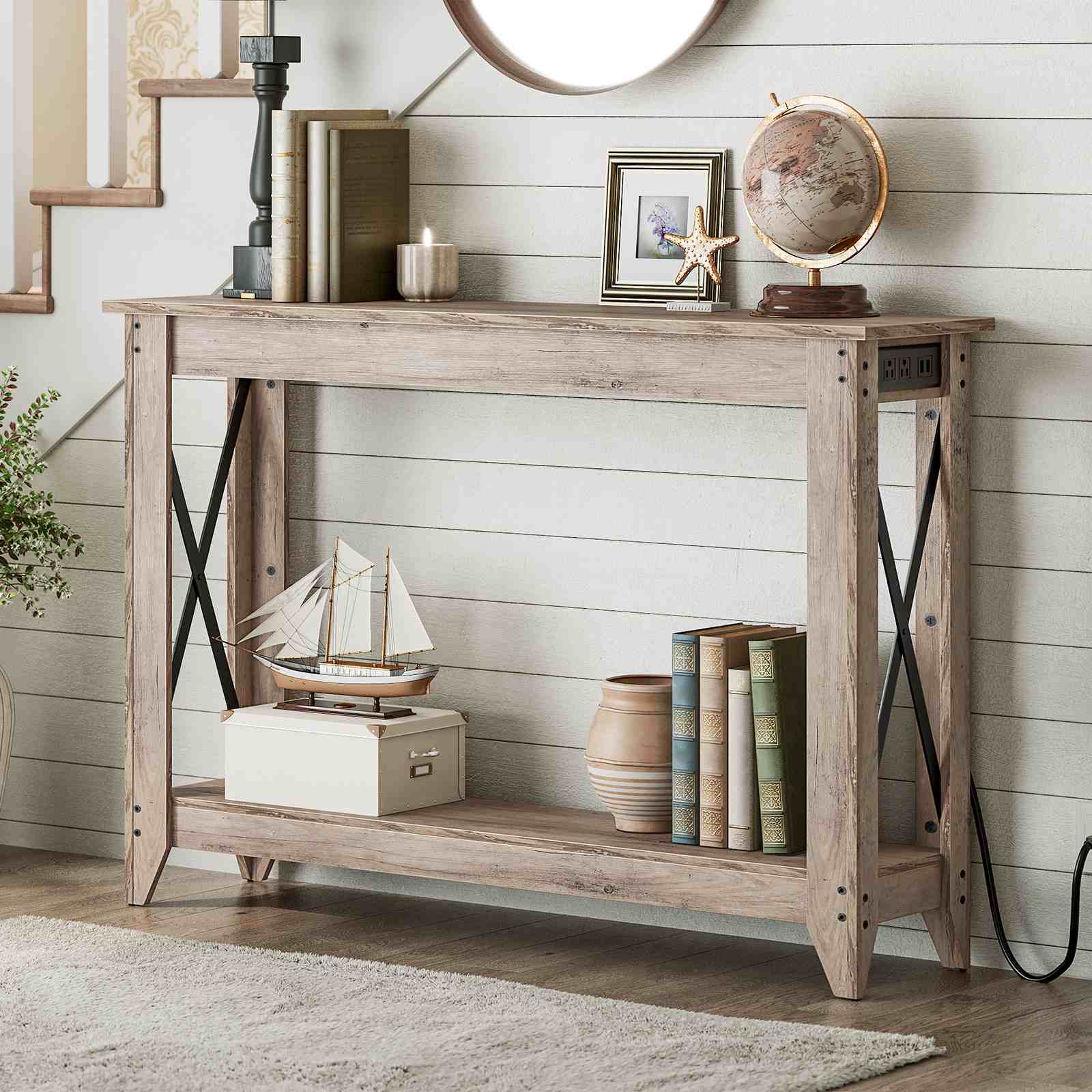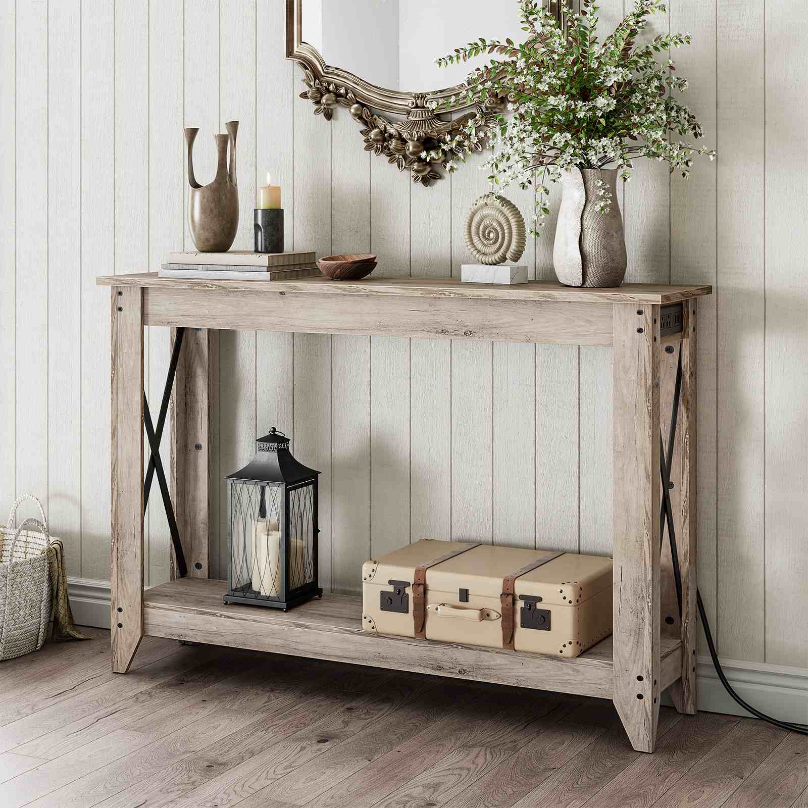 Retro Versatile Entryway Table: The greige color presents a classic and elegant temperament, paired with natural wood texture for a smooth and refined finish. The X-shaped frame design adds a modern touch, combining aesthetic appeal and functionality to enhance the overall home decoration style.