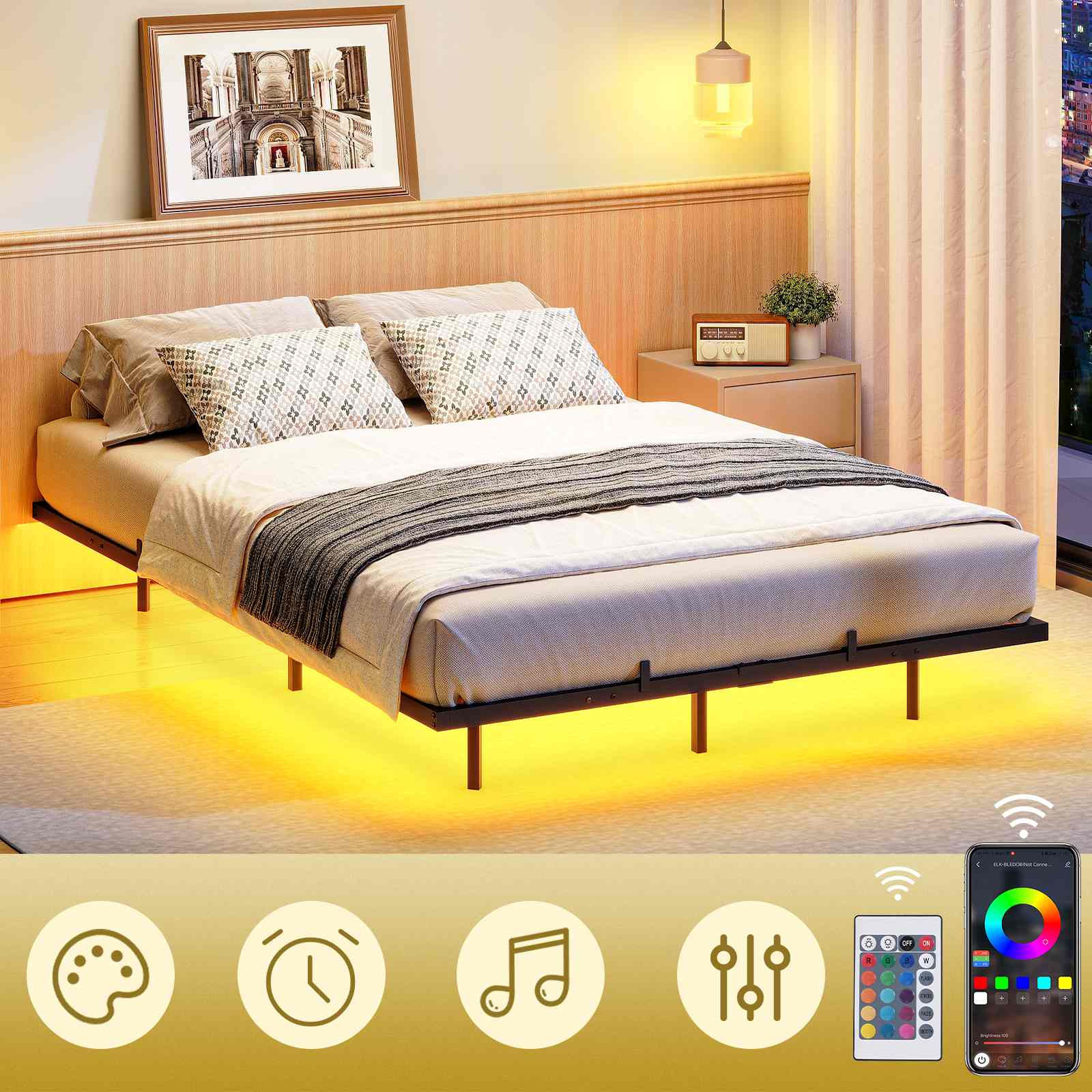 Adjustable LED Lighting System: The bed frame is equipped with an LED light bar, supporting color, brightness and mode adjustment, as well as music rhythm and timer functions. It can be easily controlled via remote control or mobile app for convenient use.
