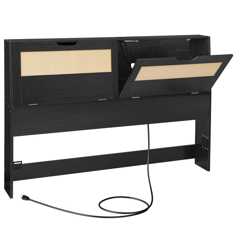 Королевские изголовки с хранением, Изголовья только для двуспальной кровати с розетками, Деревянная регулируемая высота с полками для хранения для спальни, Легкая сборка, Черный и свет