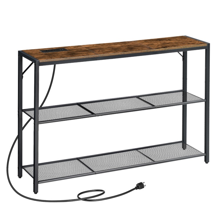 Консольный столик с зарядной станцией, 43.3"Д х 9.4"Ш х 28.7"H Диван-стол, 3-Ярусный узкий стол для прихожей, Стол для прихожей с 2 Сетчатые полки, для гостиной, прихожая, Рустик Браун
