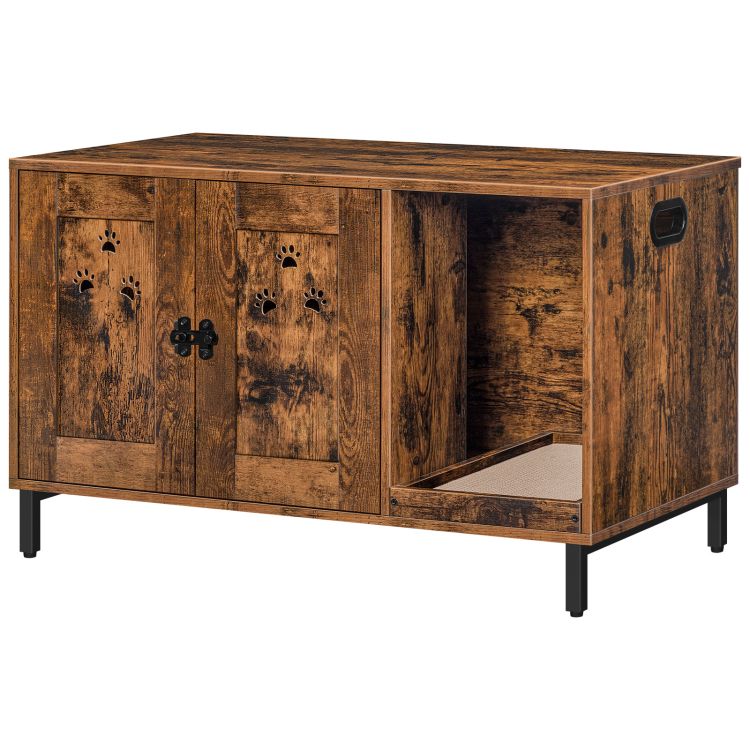 - многофункциональный кошачий домик: this handsome hidden litter box enclosure can be a piece of furniture as an end table or a nightstand. the wide top is a place for magazines, горшечные растения, лампы, water cups etc. this furniture-like enclosure hides the litter box and masquerades as a functional side table. its rustic finish and matte black metal frame blend in and complement any decorative themes