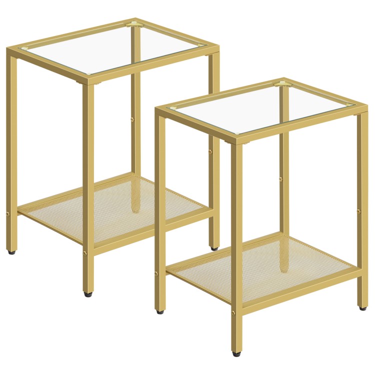 конечные таблицы набор 2, боковой стол с закаленным стеклянным верхом, узкий рядом с столом для небольшого пространства, 2-Научная тумбочка с полкой хранения, для дивана дивана и кровати, Легкая сборка, золото