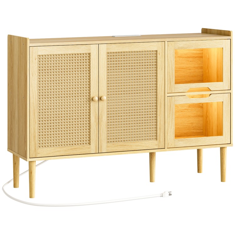 Шведский шкаф с розеткой мощности, 47.2" Кухонный шкаф для хранения серванта & Светодиодный свет, Двери с декором из ротанга, Акцентный шкаф для кофе-бара, консольный столик для входа в прихожую, Natural NL120UDCB01