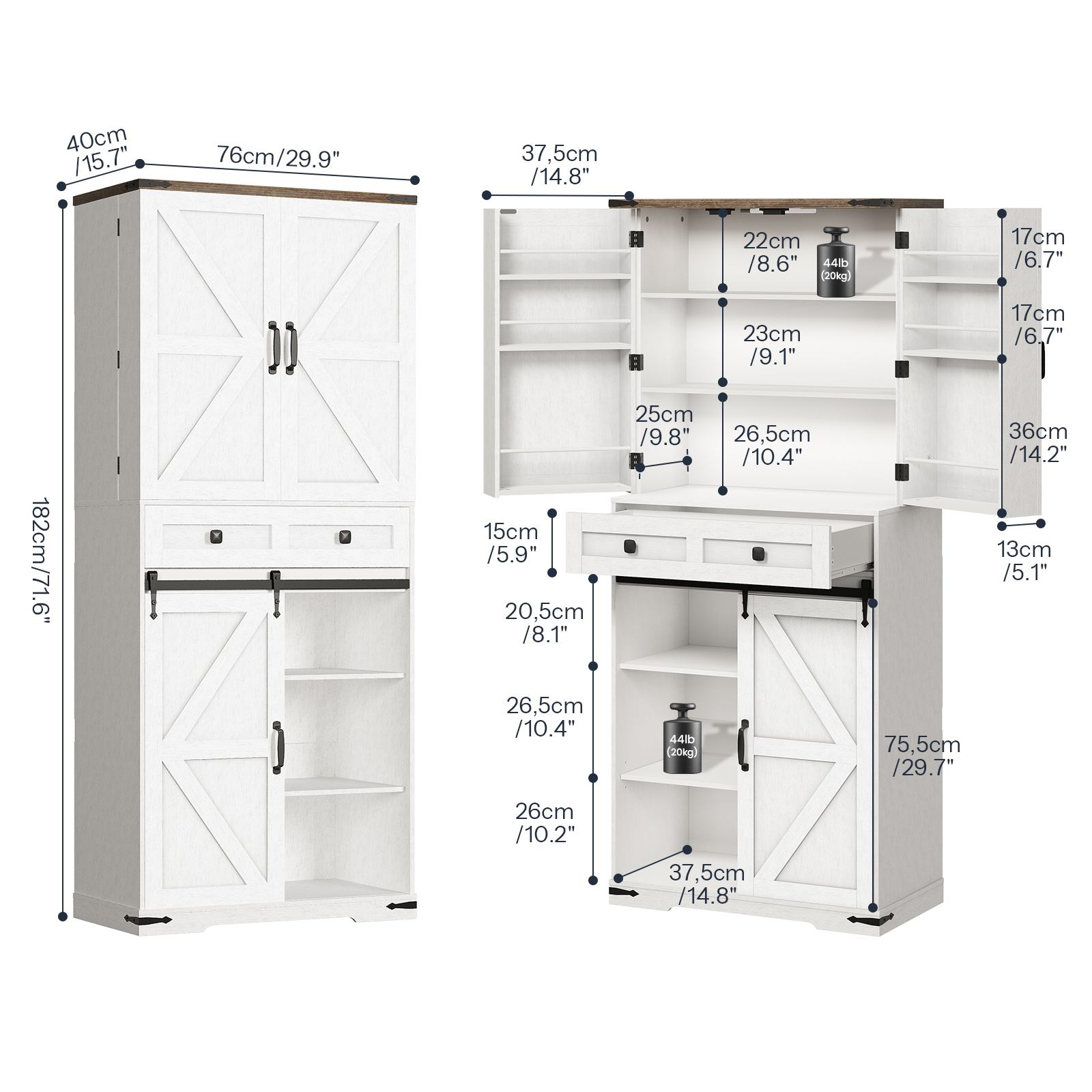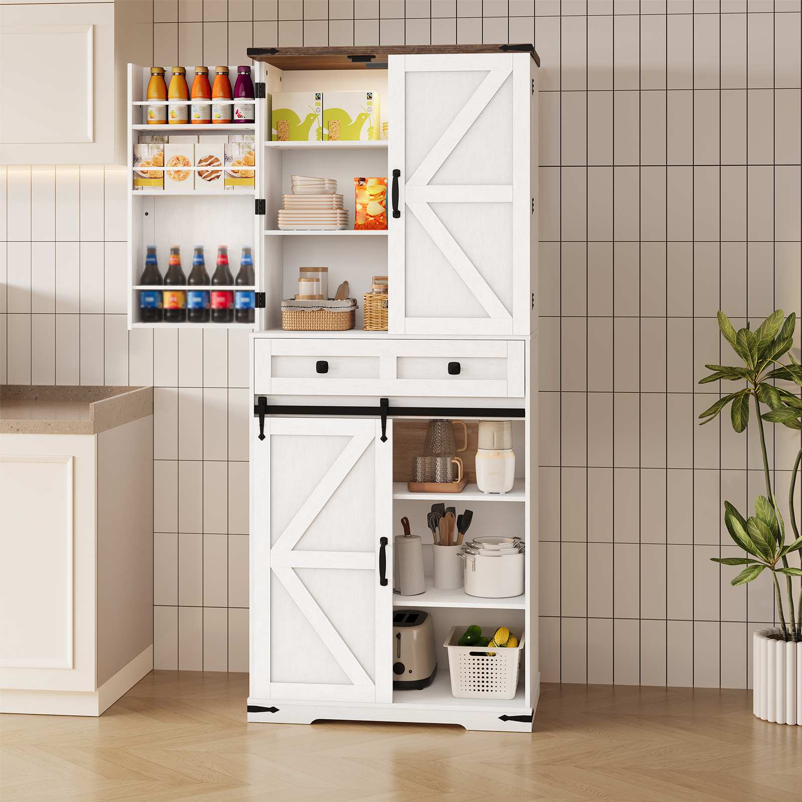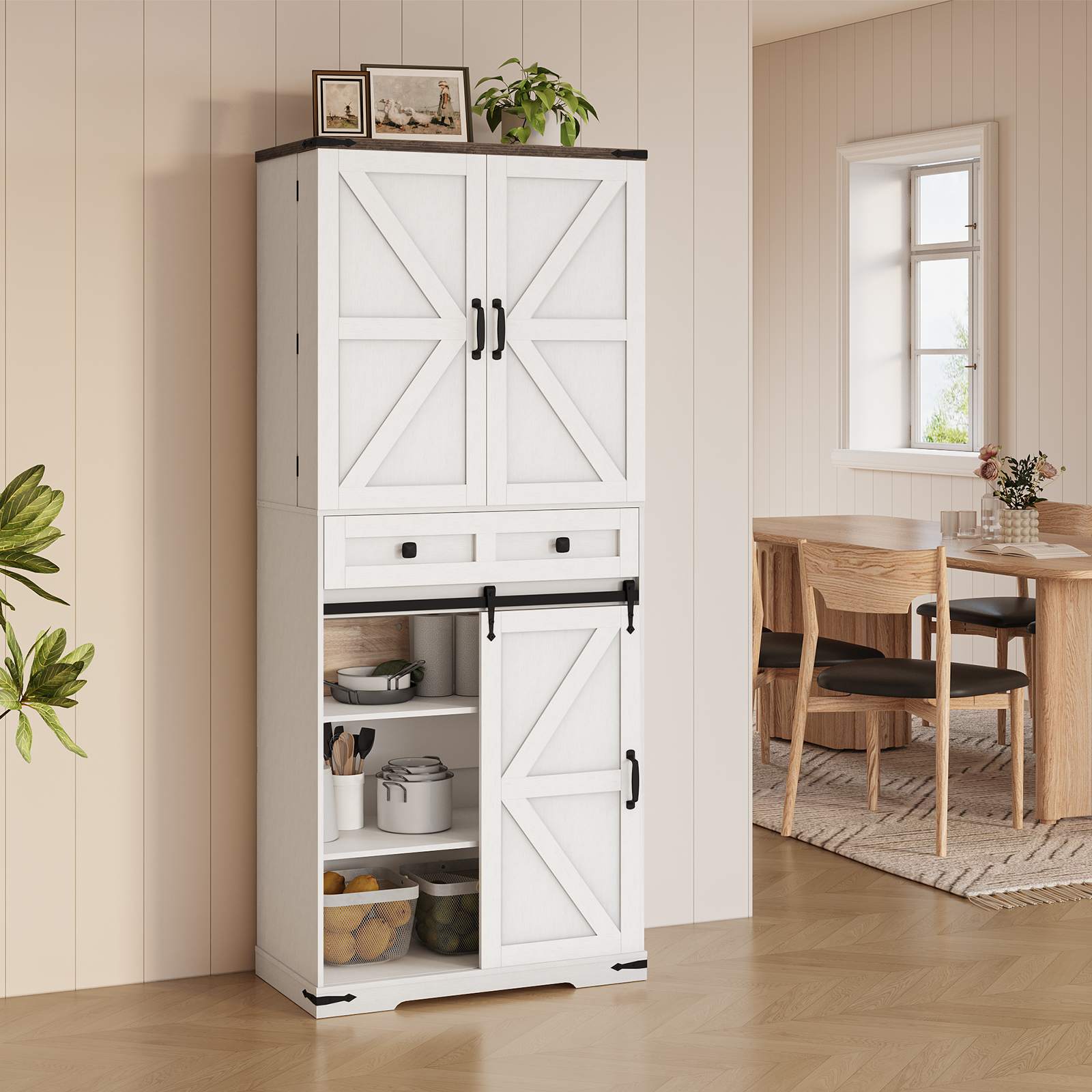 Эстетика фермы: The pantry cabinet adopts a clean and warm combination of white and walnut finishes, paired with a sliding barn door design, presenting a distinct farmhouse charm. Black metal decorations add texture, making it well-suited for kitchens, столовые и гостиные.