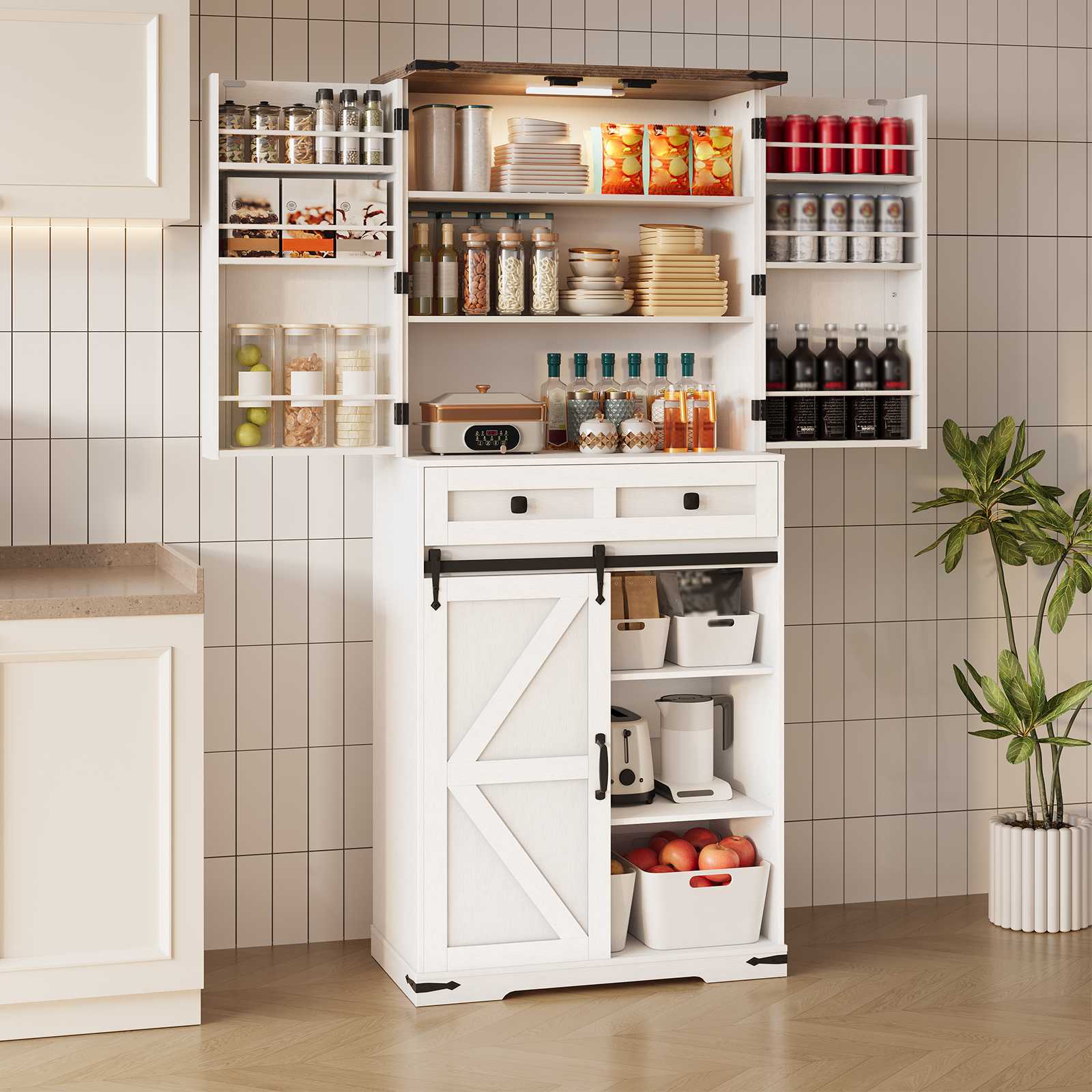 Белый стиль в стиле фермерского дома & Кухонный шкаф из орехового дерева со светодиодной сенсорной подсветкой и раздвижной дверью сарая, Регулируемая полка & Ящик для хранения вещей, Подходит для кухни & Столовая