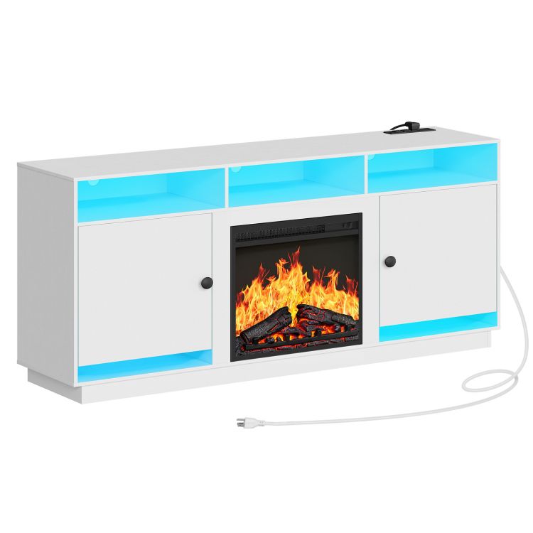 Электрический каминный телевизор с светодиодными фонарями и розетками питания, Белая телевизионная консоль для 32" 43" 50" 55" 65", развлекательный центр с хранением и регулируемыми стеклянными полками, белый