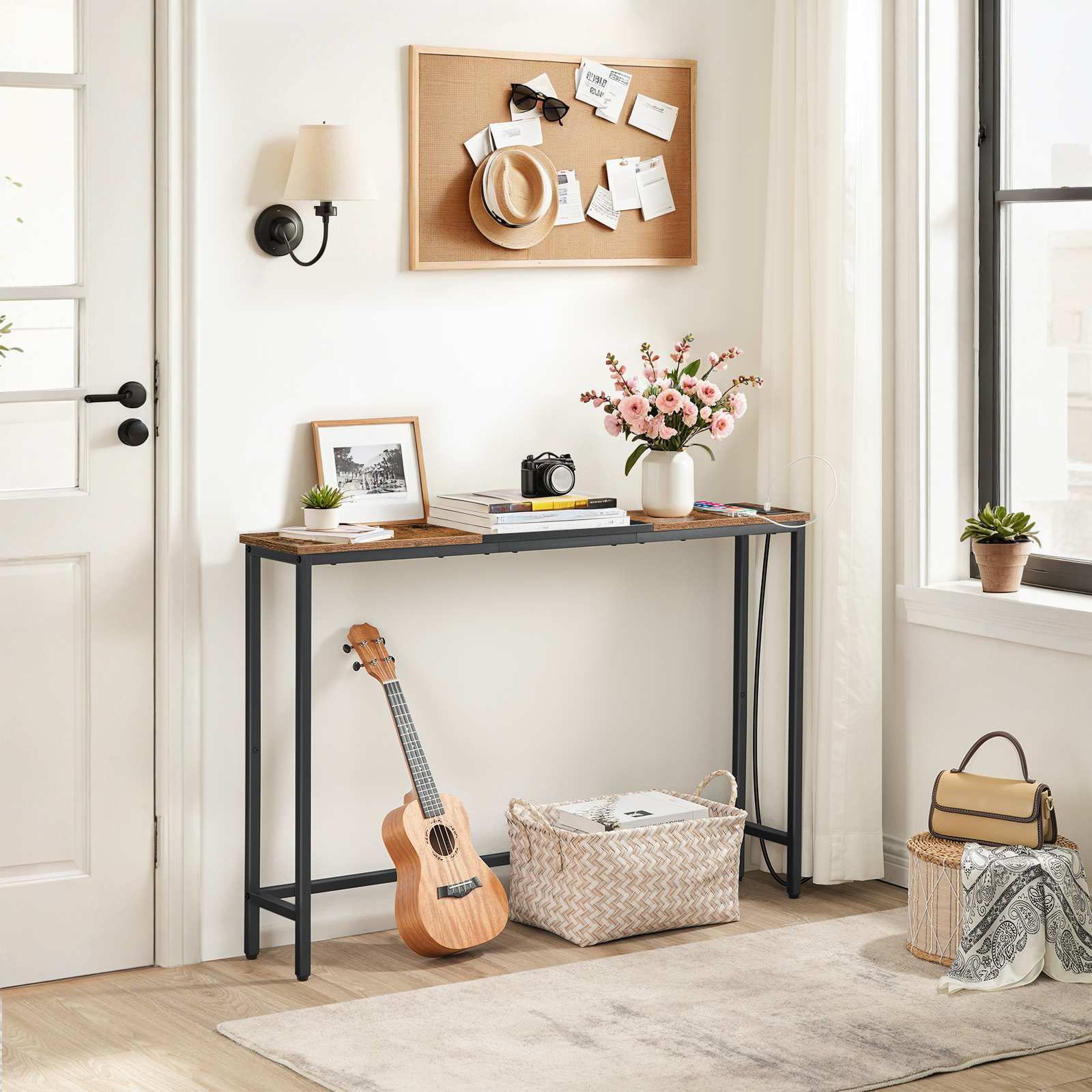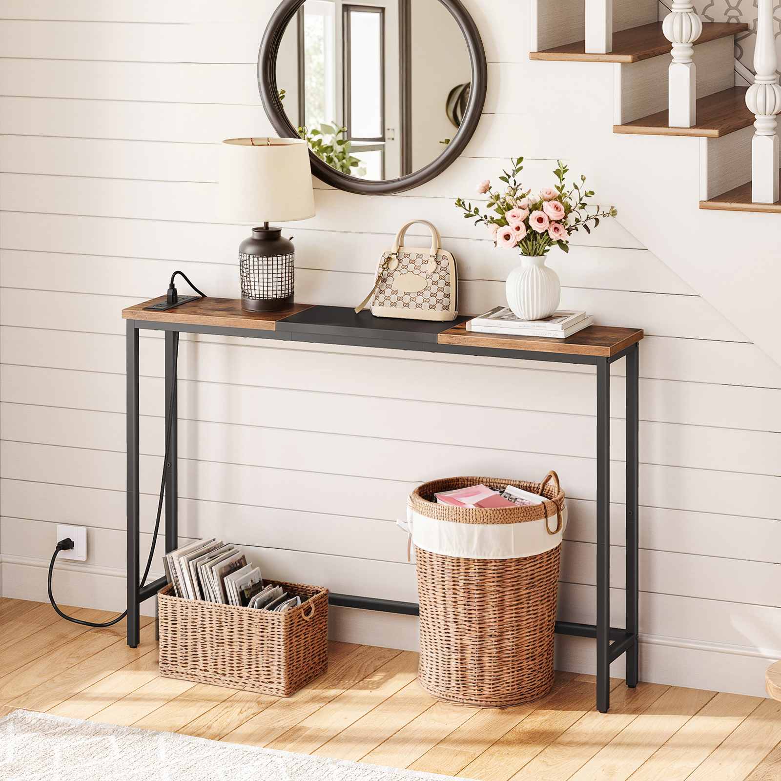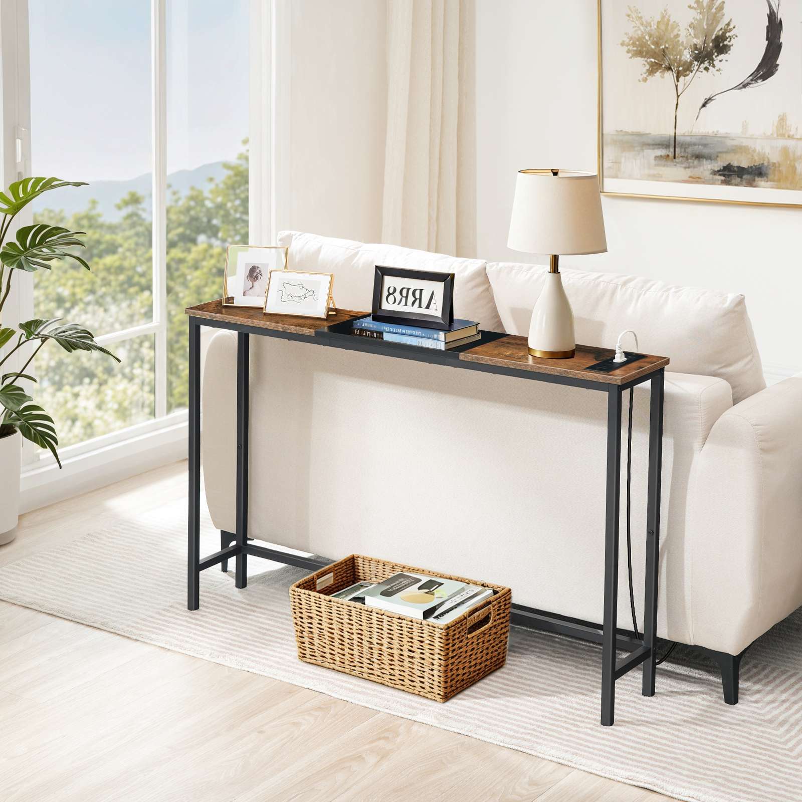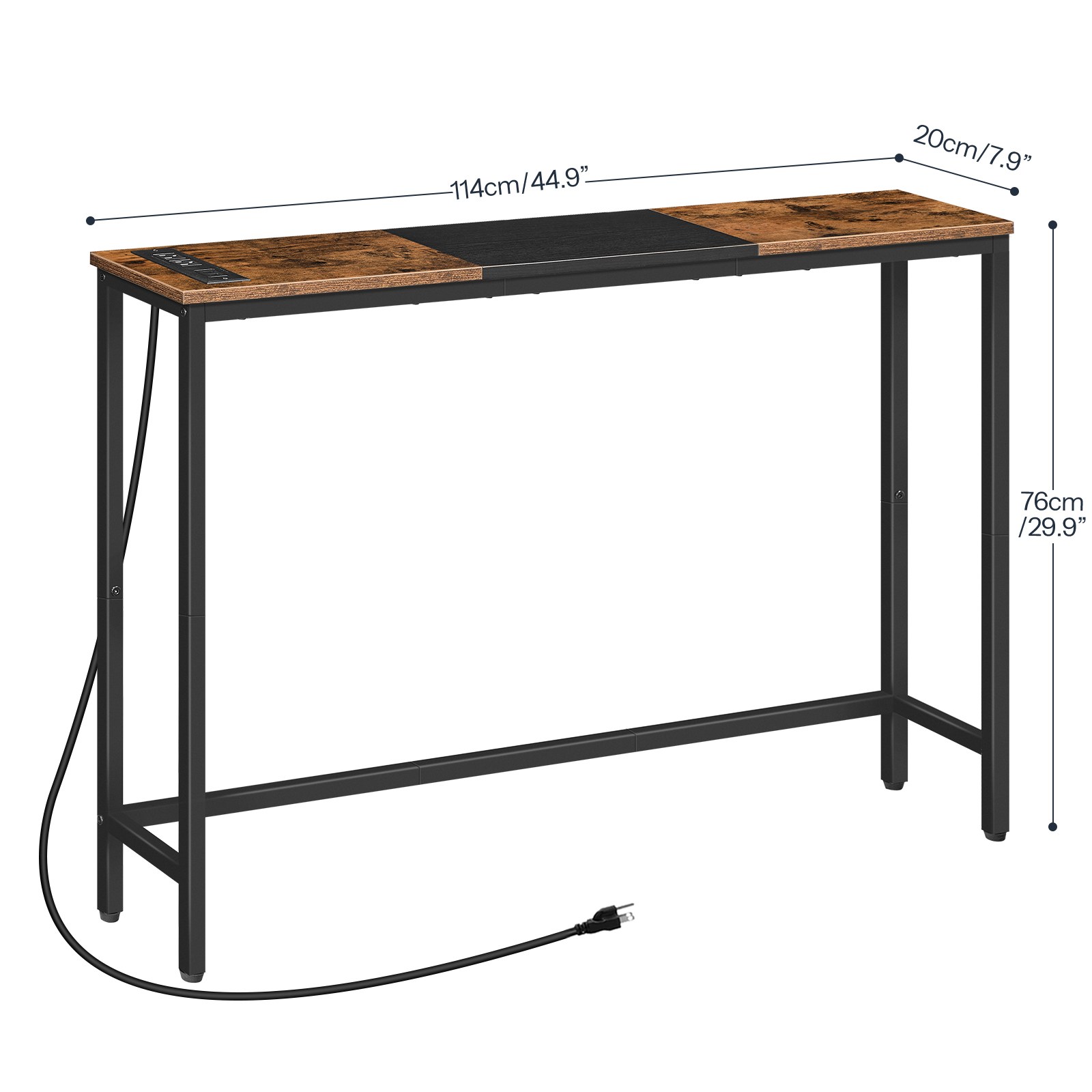Úzky konzolový stolík s napájacími zásuvkami, 44.9-Palec pohovka, Štíhle za gaučovým stolom, Vchodová displejová polica, pre obývaciu izbu, Foyer, Predsieň, Rustikálna hnedá a čierna