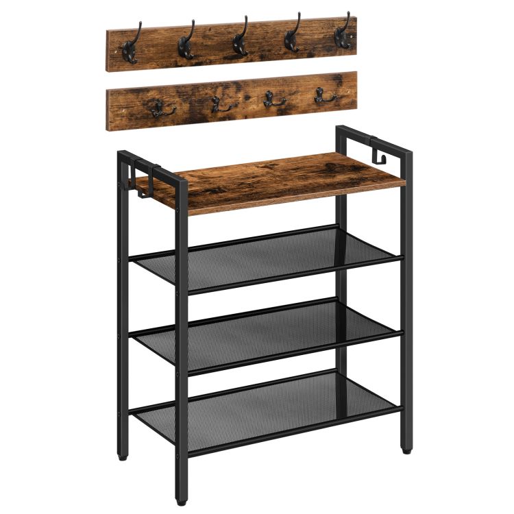 Stojan na topánky, 4 Organizátor úložného priestoru s obuvou s háčikmi s kabátmi, Súprava nábytku, 3-dizajn in-1, Drevený nábytok s kovovým rámom, pre chodbu, Skriňa, Rustikálna hnedá