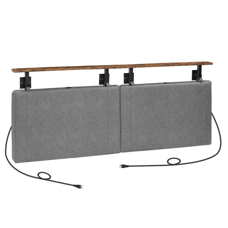 čelo postele, nástenná čelo čela 4 USB porty a LED svetlo, čalúnenie, otvorená úložná polica, do spálne, bar, stravovanie alebo vstup, veľkosti kráľovnej, rustikálny hnedý a šedý