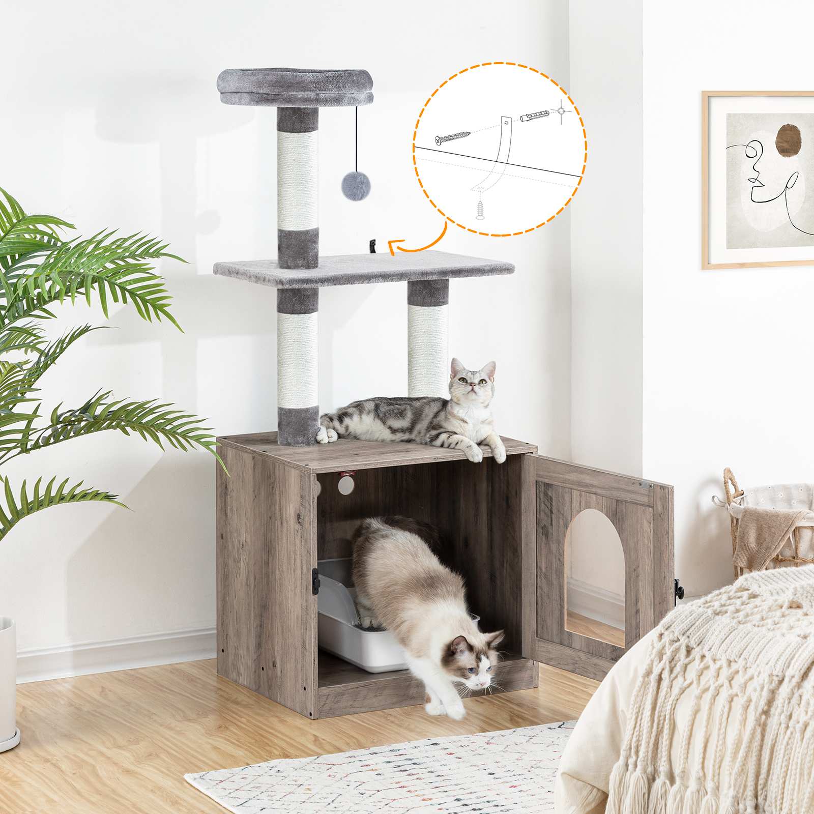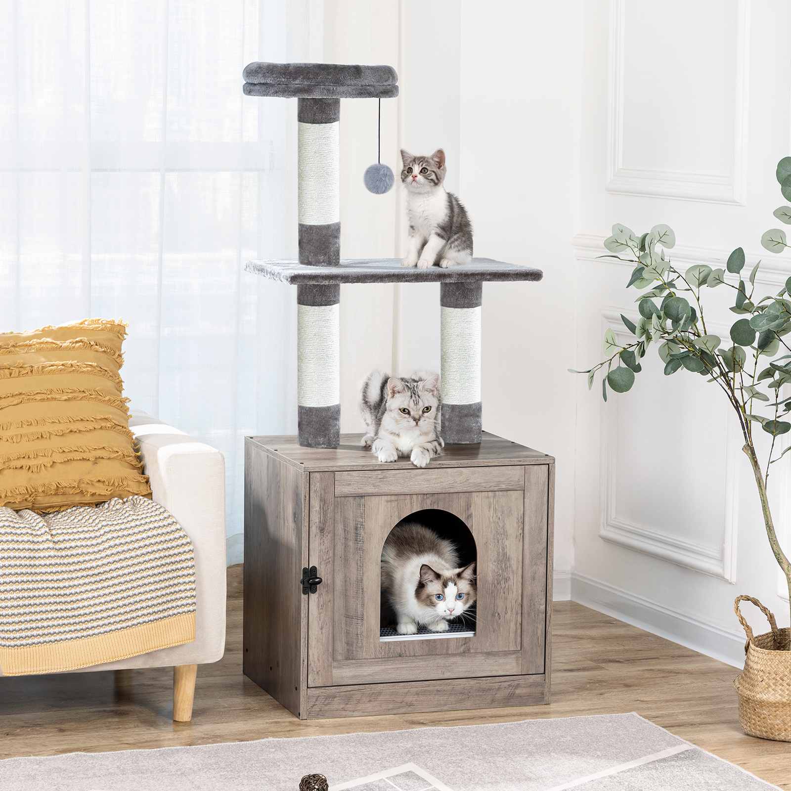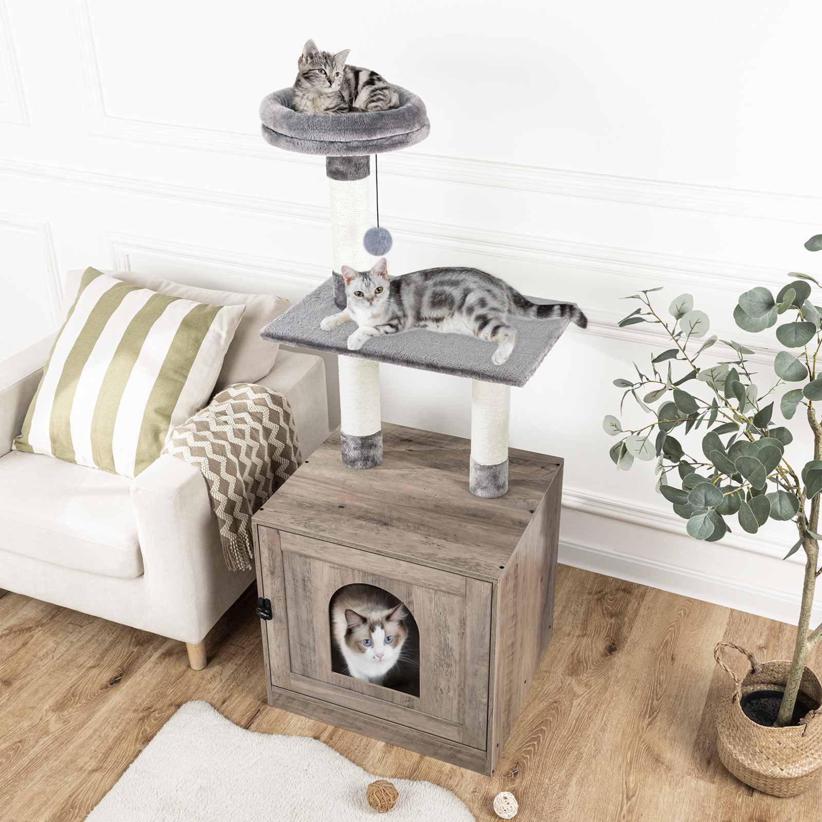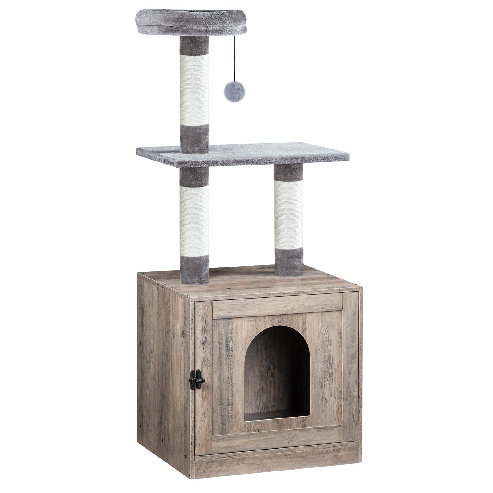 Šedá drevená ohrada na podstielku pre mačky s vežou na strome pre mačky, Skrytá toaleta pre domáce zvieratá integrovaná so škrabadlami a plyšovým bidielkom, Viacvrstvový vnútorný nábytok pre mačky