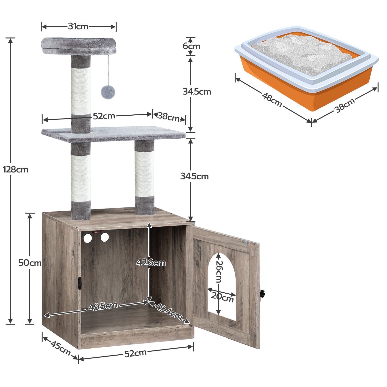 Optimized Dimensions: The cat litter furniture has the following specifications: overall size 52cm (L) × 45cm (W) × 128cm (H); internal usable area 49.5cm (L) × 43.4cm (W) × 42.6cm (H). It is compatible with most cats and cat litter boxes, effectively preventing litter scattering.