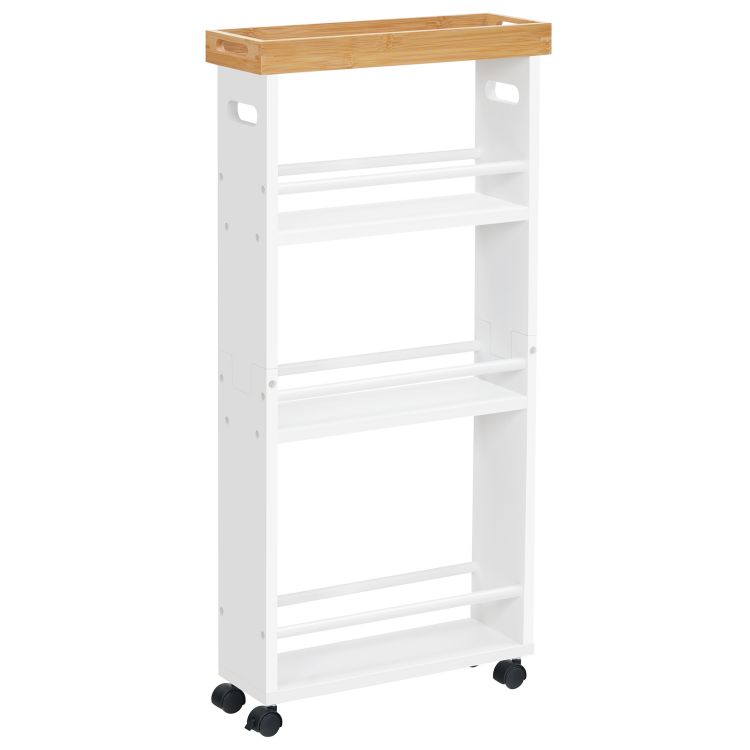 4-Slim Slim Storage košík s kolesami, bambus valcujúci kuchynský vozík s odnímateľným podnosom, Práčovňa s otvoreným regálom police pre malé priestory v spálni, kuchyňa, práčovňa, biela