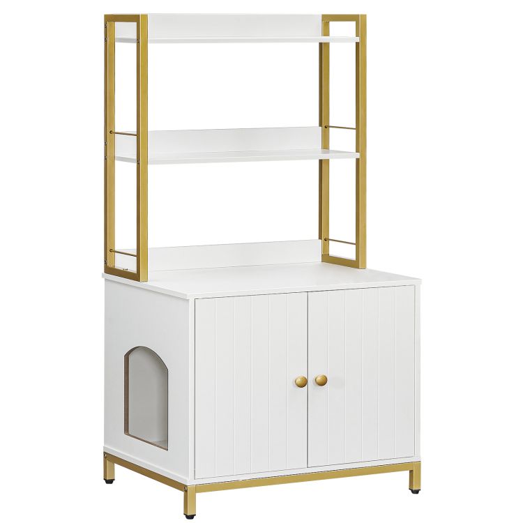Raflarla beyaz ve altın çöp kutusu muhafazası, Ahşap kedi kumu kutusu mobilyaları, Kapılarla büyük gizli çöp kutusu, Saklama Dolabı, Çöp kutusunun çoğu için