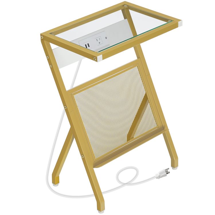 Золотий бічний стіл, z-shaped end table with charging station, modern tv tray table with magazine rack, tempered glass coffee table for small space, спальня, офіс, вітальня, gold gd28ubz01
